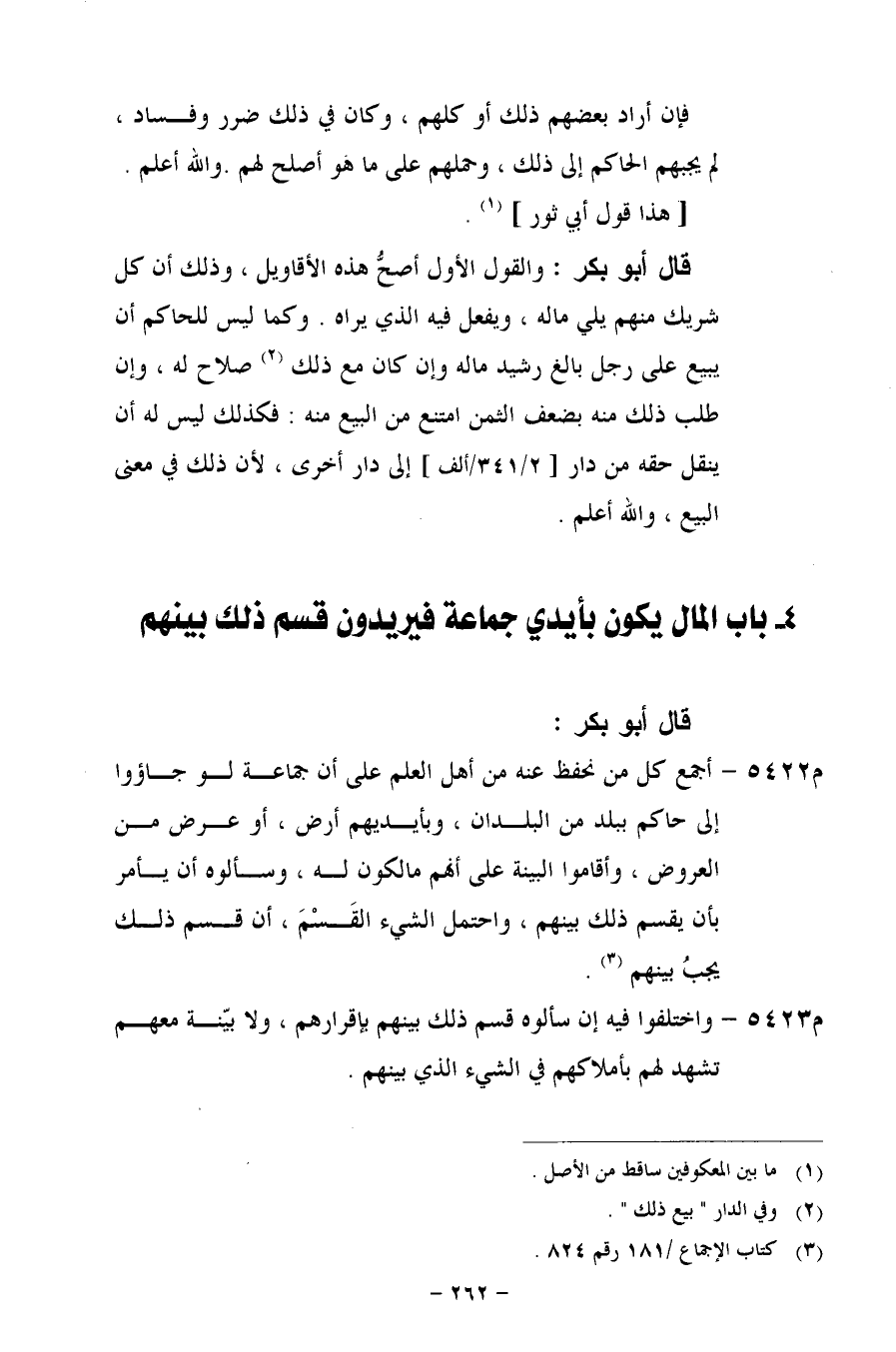 م 5422 - أجمع كل من نحفظ عنه من أهل العلم على أن جماعة لو جاؤوا إلى حاكم ببلد من البلدان، وبأيديهم أرض، أو عرض من العروض، وأقاموا البينة على أنهم مالكون له، وسألوه أن يأمر بأن يقسم ذلك بينهم، واحتمل الشيء القَسْمَ، أن قسم ذلك يجبُ بينهم.