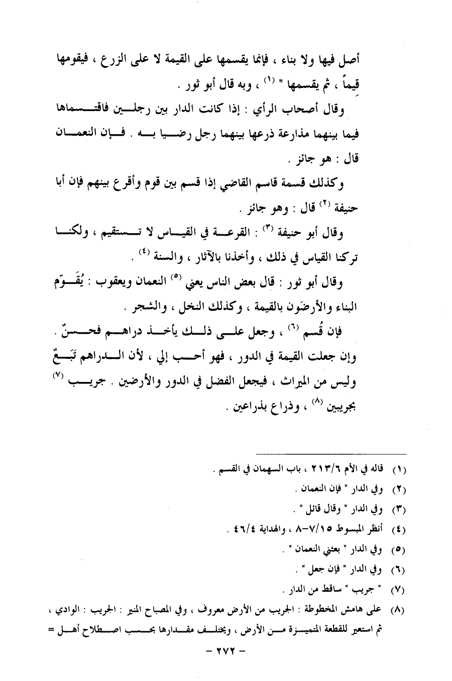 وإن جعلت القيمة في الدور، فهو أحب إلى، لأن الدراهم تَبَعٌ وليس من الميراث، فيجعل الفضل في الدور والأرضين. جريب (¬5) بجريبين (¬6)، وذراع بذراعين.