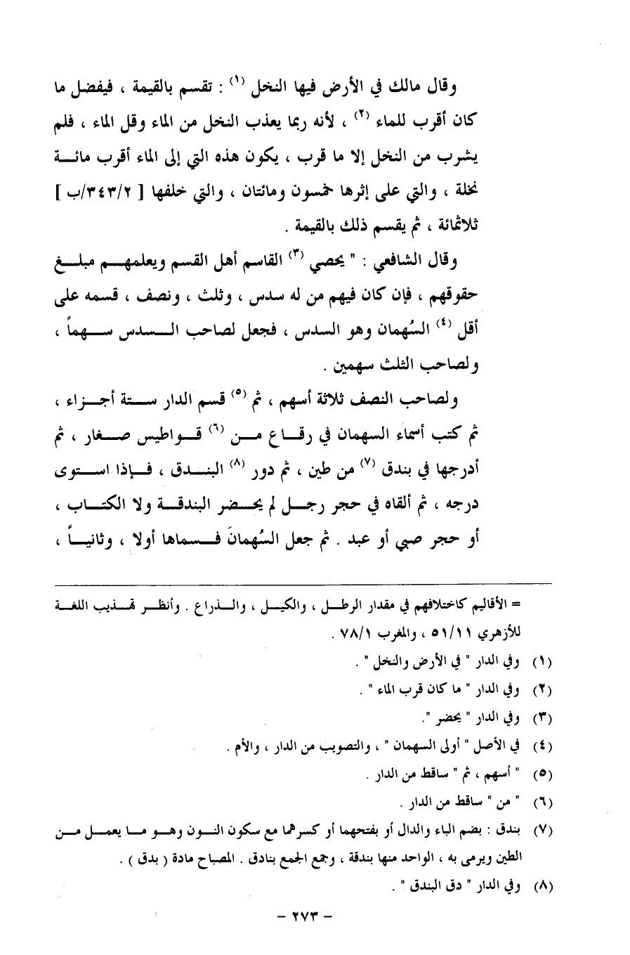 ولصاحب النصف ثلاثة أسهم، ثم (¬5) قسم الدار ستة أجزاء، ثم كتب أسماء السهمان في رقاع من (¬6) قواطيس صغار، ثم أدرجها في بندق من طين، ثم دور (¬7) البندق، فإذا استوى درجه، ثم ألقاه في حجر رجل لم يحضر البندقة ولا الكتاب، أو حجر صبي أو عبد. ثم جعل السُهمانَ فسماها أولاً، وثانياً،