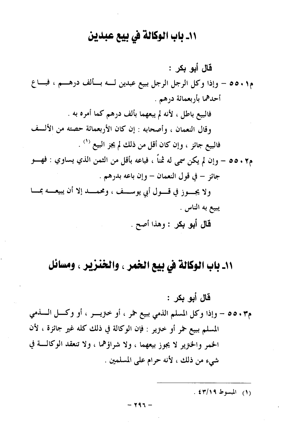 م 5503 - وإذا وكل المسلم الذمي ببيع خمر، أو خنزير، أو وكل الذمي المسلم ببيع خمر أو خنزير: فإن الوكالة في ذلك كله غير جائزة، لأن الخمر والخنزير لا يجوز بيعهما، ولا شراؤهما، ولا تنعقد الوكالة في شيء من ذلك، لأنه حرام على المسلمين.