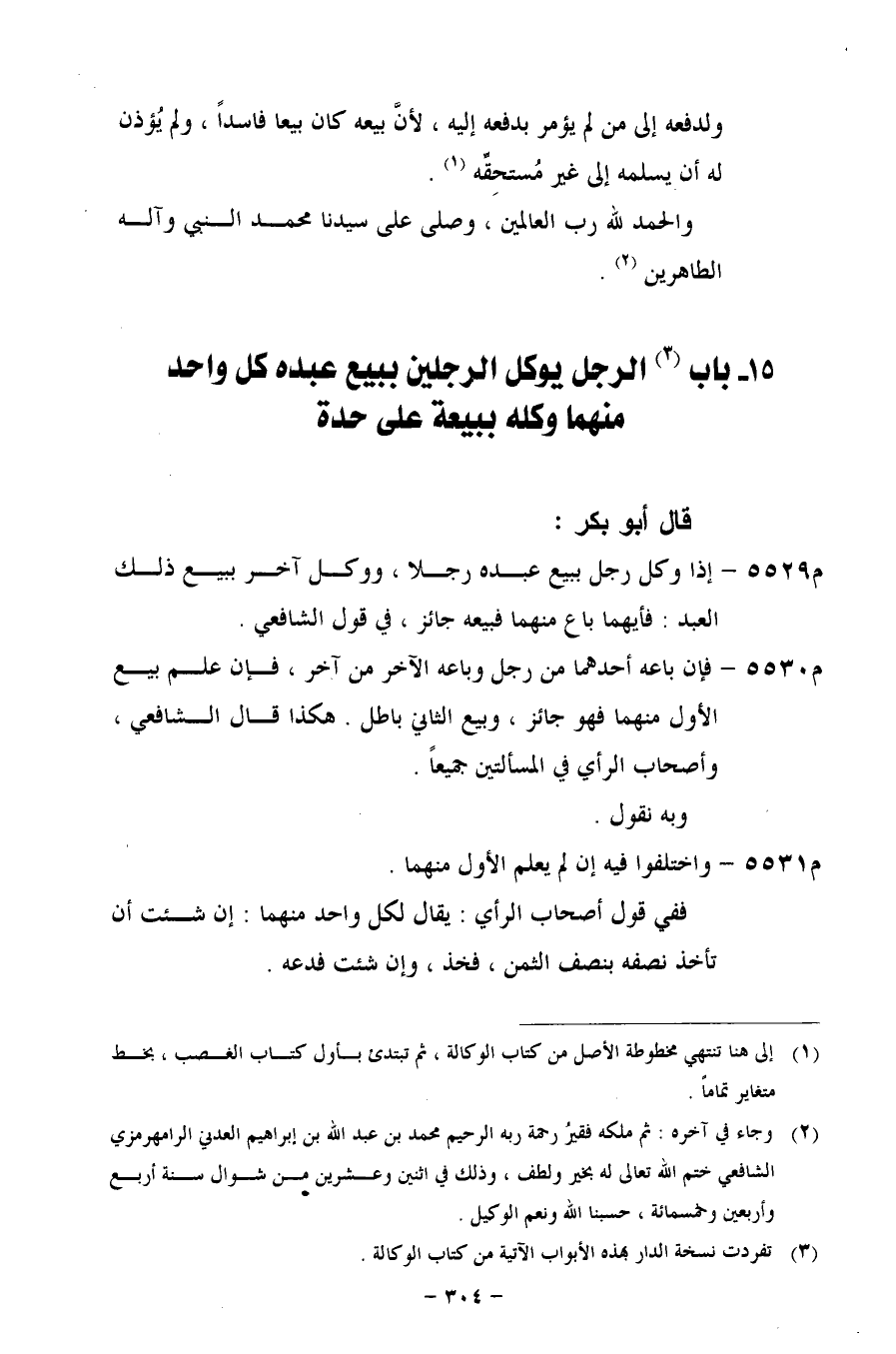 (¬1) إلى هنا تنتهي مخطوطة الأصل من كتاب الوكالة، ثم تبتدئ بأول كتاب الغصب، بخط متغاير تماماً.