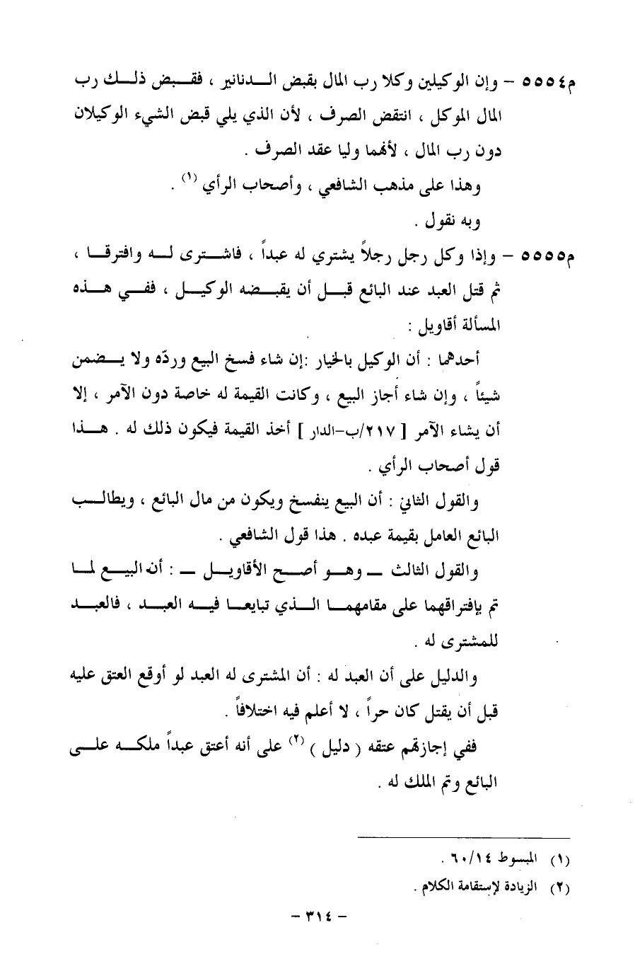 م 5554 - وإن الوكيلين وكلا رب المال بقبض الدنانير، فقبض ذلك رب المال الموكل، انتقض الصرف، لأن الذي يلي قبض الشيء الوكيلان دون رب المال، لأنهما وليا عقد الصرف.