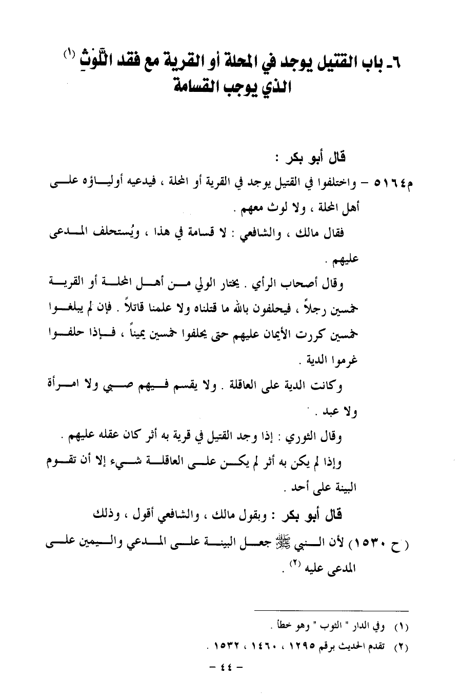 6 - باب القتيل يوجد في المحلة أو القرية مع فقد الَّلوْثِ (¬1) الذي يوجب القسامة