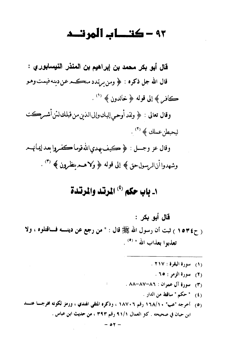 ح 1534) ثبت أن رسول الله- صلى الله عليه وسلم - قال: "من رجع عن دينه فاقتلوه، ولا تعذبوا بعذاب الله".