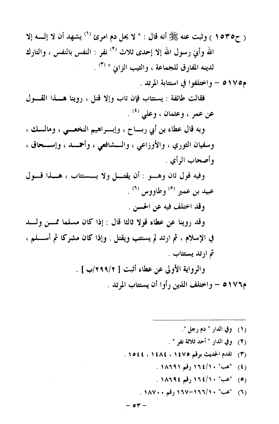 (ح 1535) وثبت عنه - صلى الله عليه وسلم - أنه قال: "لا يحل دم امرئ (¬1) يشهد أن لا إله إلا
