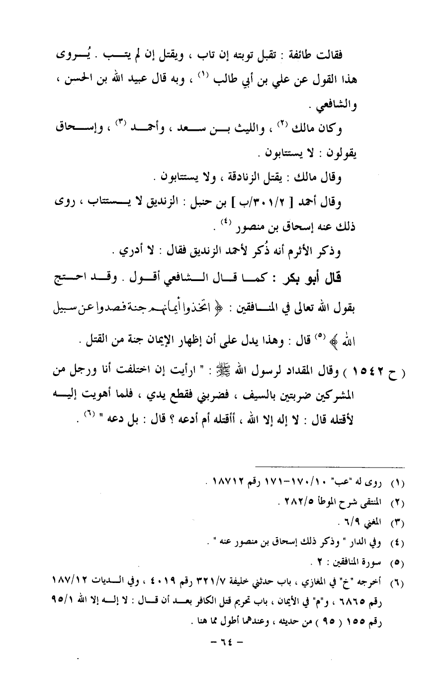 (ح 1542) وقال المقداد لرسول الله- صلى الله عليه وسلم -: "ارأيت إن اختلفت أنا ورجل من المشركين ضربتين بالسيف، فضربني فقطع يدي، فلما أهويت إليه لأقتله قال: لا إله الله، أأقتله أم أدعه؟ قال: بل دعه".