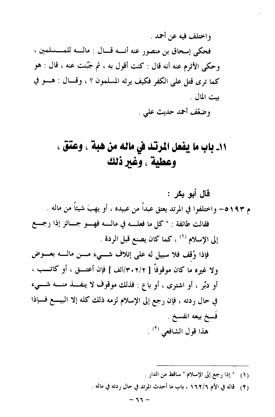 م 5193 - واختلفوا في المرتد يعتق عبداً من عبيده، أو يهبَ شيئاً من ماله.