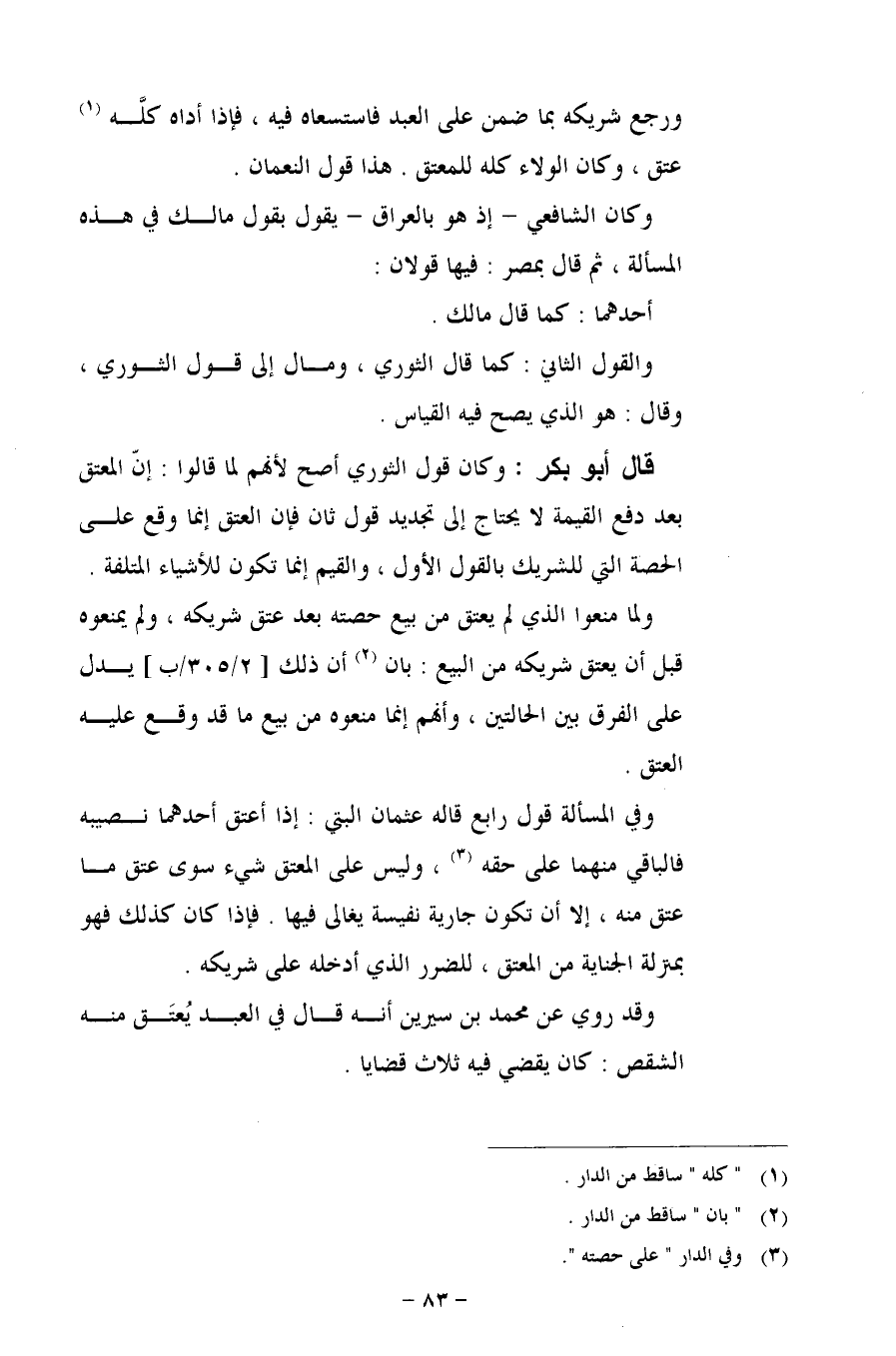 قال أبو بكر: وكان قول الثوري أصح لأنهم لما قالوا: إنّ المعتق بعد دفع القيمة لا يحتاج إلى تجديد قول ثان فإن العتق إنما وقع على الحصة التي للشريك بالقول الأول، والقيم إنما تكون للأشياء المتلفة.