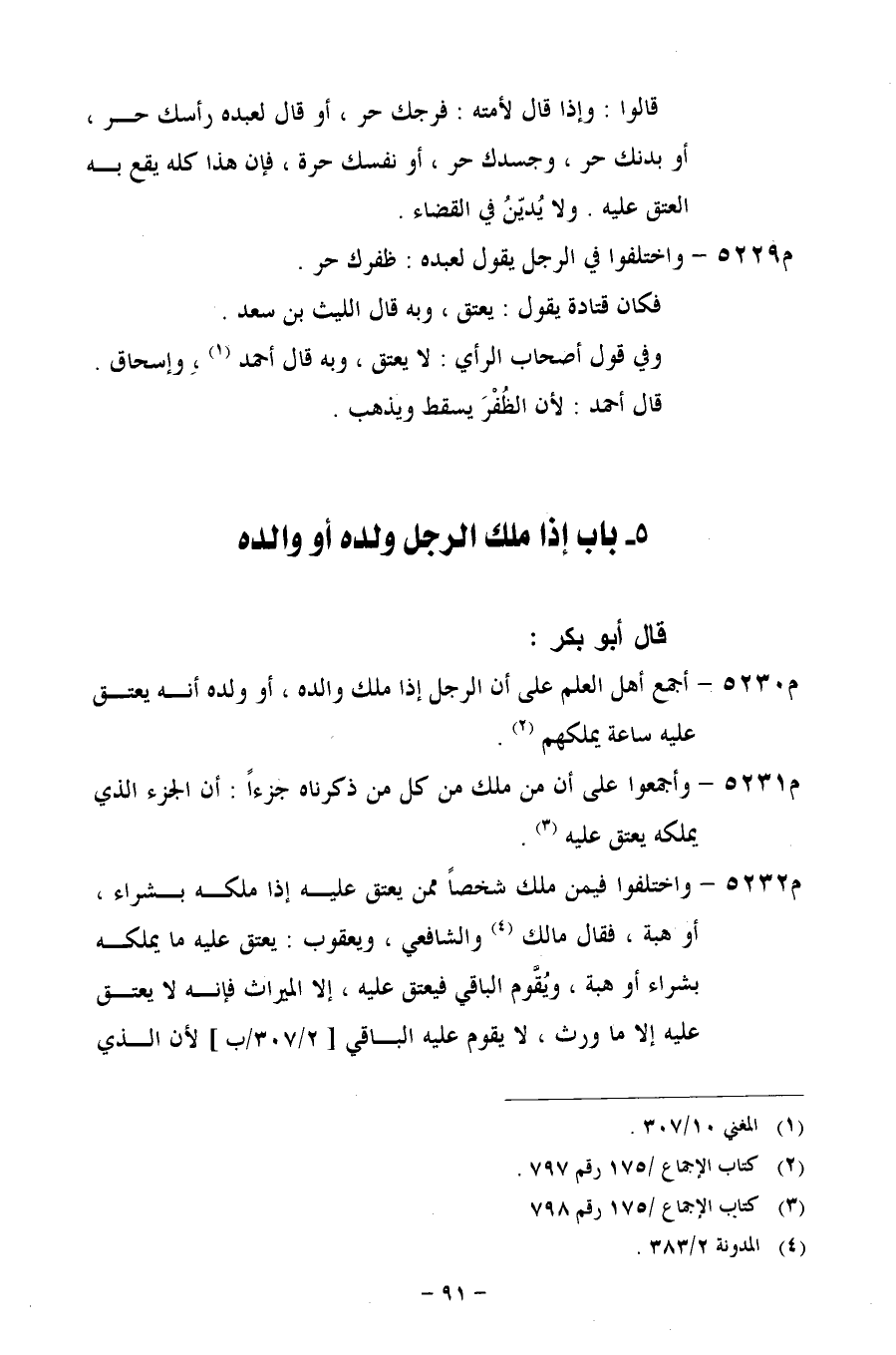 م 5230 - أجمع أهل العلم على أن الرجل إذا ملك والده، أو ولد أنه يعتق عليه ساعة يملكهم.