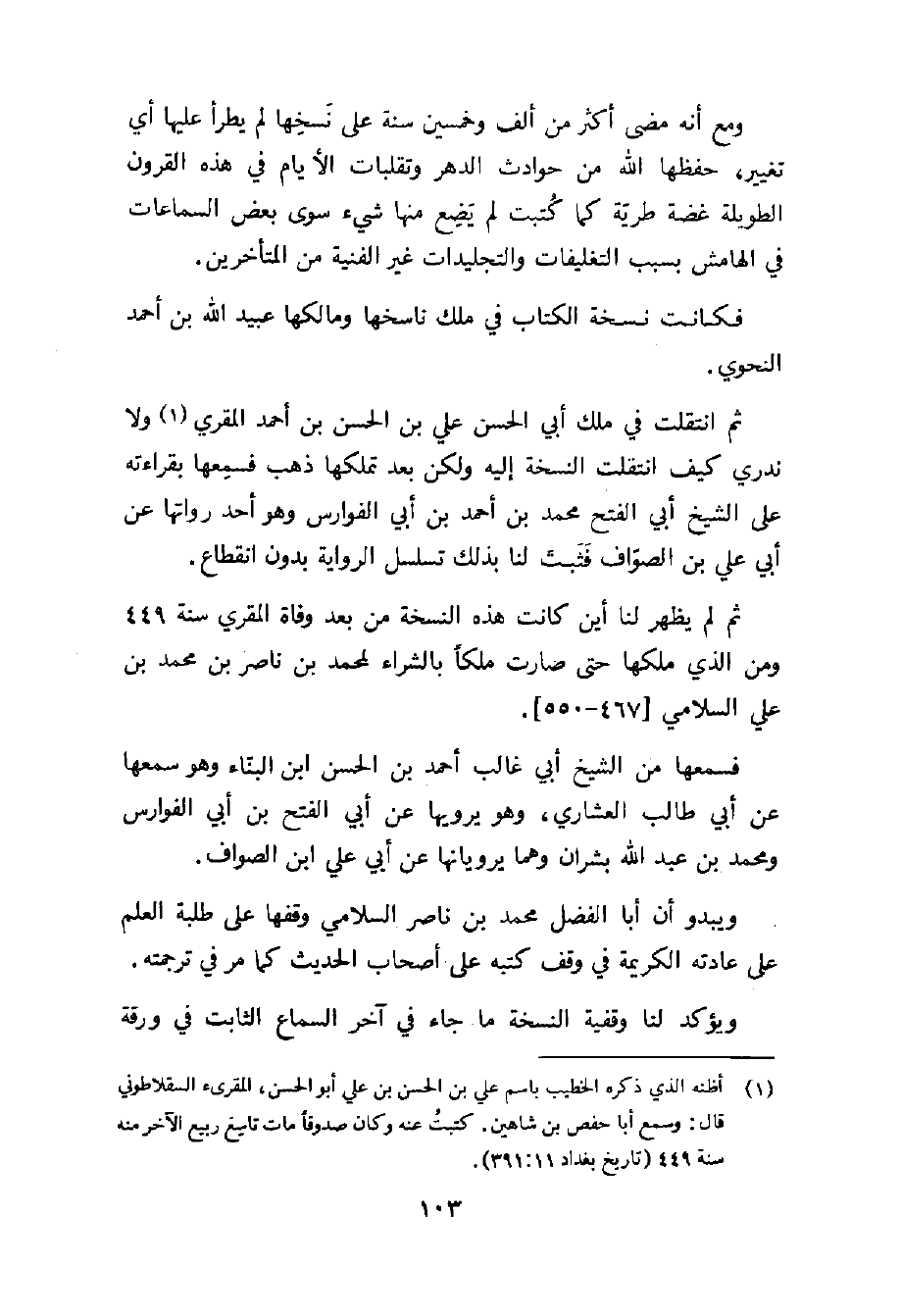 ثم انتقلت في ملك أبي الحسن علي بن الحسن بن أحمد المقري (1) ولا ندري كيف انتقلت النسخة إليه ولكن بعده تملكها ذهب فسمعها بقراءته على الشيخ أبي الفتح محمد بن أحمد بن أبي الفوارس وهو أحد رواتها عن أبي علي بن الصواف فثبت لنا بذلك تسلسل الرواية بدون انقطاع.