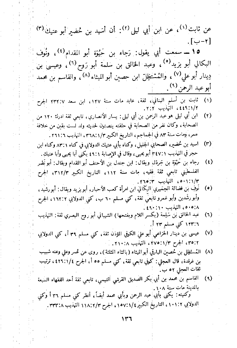 15 - سَمِعت أبي يَقُول رَجَاء بن حَيْوَة أَبُو الْمِقْدَام ونوف الْبكالِي أَبُو يزِيد وَعبد الْخَالِق بن سَلمَة أَبُو روح وَعِيسَى بن دِينَار أَبُو عَليّ والمستظل بن حُصَيْن أَبُو الميثاء وَالقَاسِم بن مُحَمَّد أَبُو عبد الرَّحْمَن