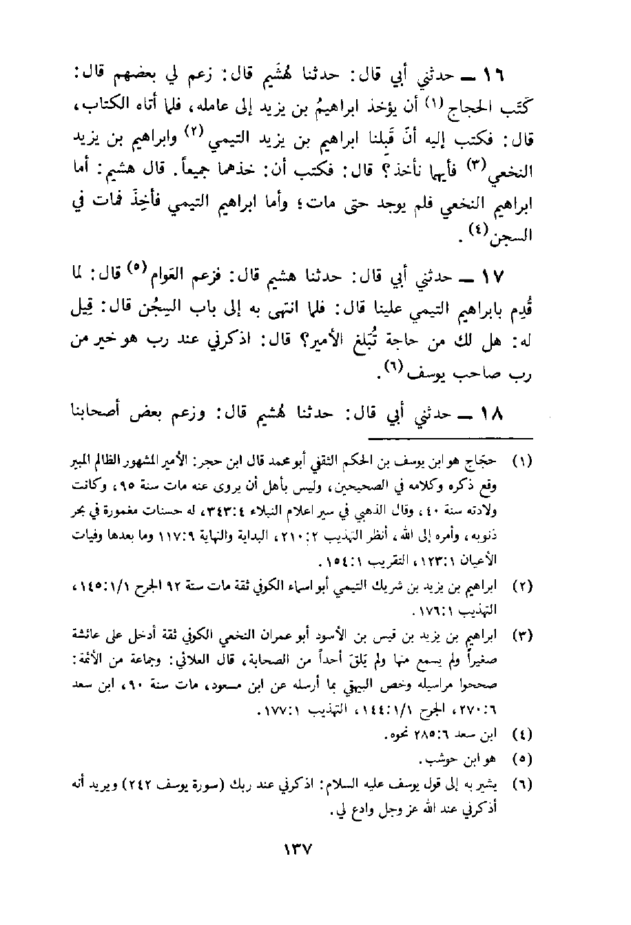 16 - حَدثنِي أبي قَالَ حَدثنَا هشيم قَالَ زعم لي بَعضهم قَالَ كتب الْحجَّاج أَن يُؤْخَذ إِبْرَاهِيم بن يزِيد إِلَى عَامله فَلَمَّا أَتَاهُ الْكتاب قَالَ فَكتب إِلَيْهِ أَن قبلنَا إِبْرَاهِيم بن يزِيد التَّيْمِيّ وَإِبْرَاهِيم بن يزِيد النَّخعِيّ فَأَيّهمَا نَأْخُذ قَالَ فَكتب أَن خذهما جَمِيعًا قَالَ هشيم أما إِبْرَاهِيم النَّخعِيّ فَلم يُوجد حَتَّى مَاتَ وَأما إِبْرَاهِيم التَّيْمِيّ فَأخذ فَمَاتَ فِي السجْن