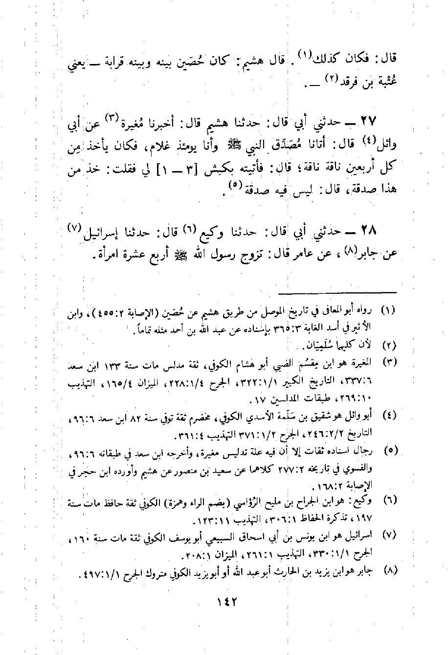 27 - حَدثنِي أبي قَالَ حَدثنَا هُشَيْمٌ قَالَ أَخْبَرَنَا مُغِيرَةُ عَنْ أَبِي وَائِلٍ قَالَ أَتَانَا مُصَدِّقُ النَّبِيَّ صَلَّى اللَّهُ عَلَيْهِ وَسَلَّمَ وَأَنَا يَوْمَئِذٍ غُلامٌ فَكَانَ يَأْخُذُ مِنْ كُلِّ أَرْبَعِينَ نَاقَةً نَاقَةً قَالَ فَأَتَيْتُهُ بِكَبْشٍ لِي فَقُلْتُ خُذْ مِنْ هَذَا صَدَقَةً قَالَ لَيْسَ فِيهِ صَدَقَةٌ