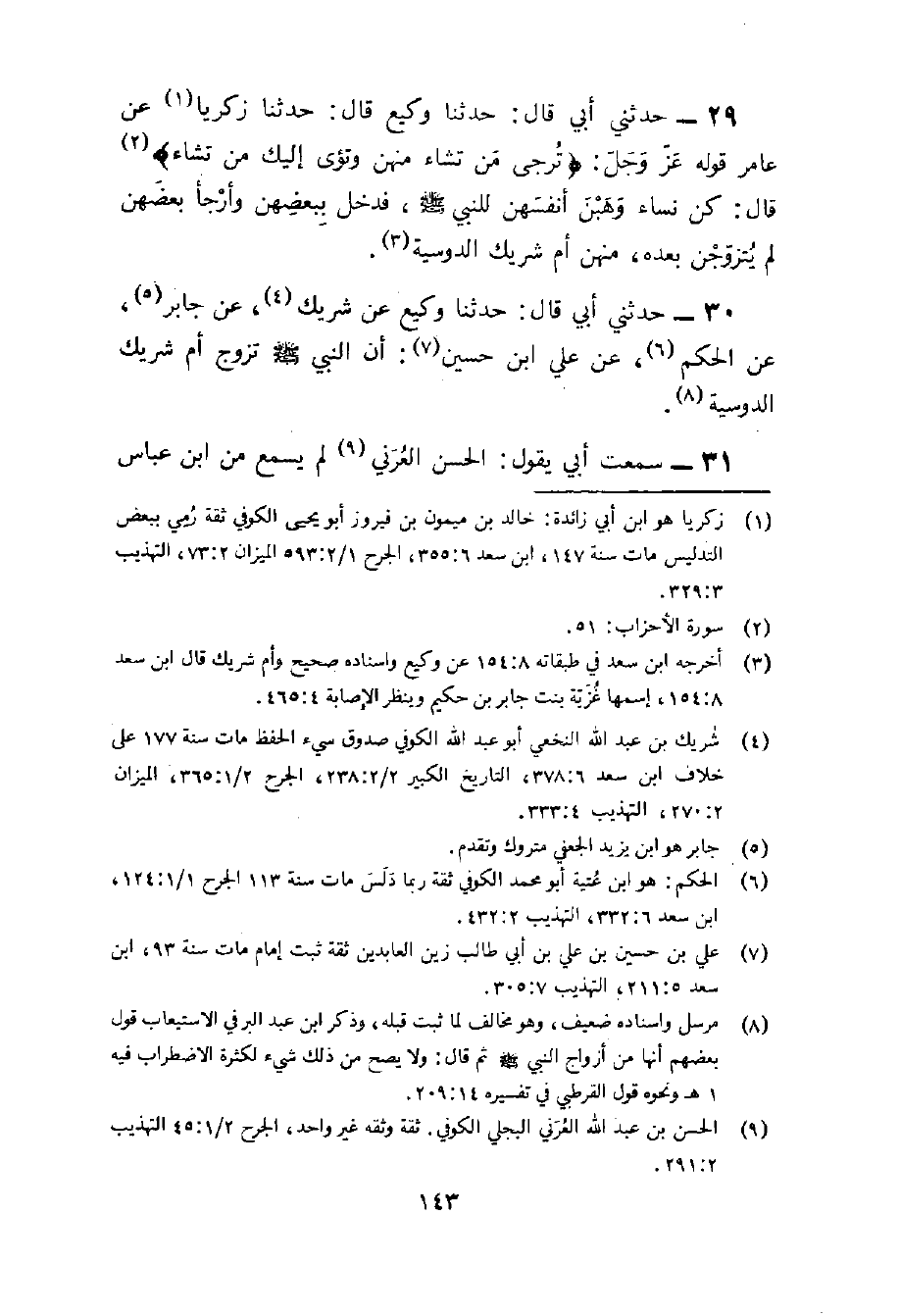 29 - حَدثنِي أبي قَالَ حَدثنَا وَكِيع قَالَ حَدثنَا زَكَرِيَّا عَن عَامر قَوْله عز وَجل ترجى من تشَاء مِنْهُنَّ وتؤى إِلَيْك من تشَاء قَالَ كن نسَاء وهبْنَ أَنْفسهنَّ للنَّبِي صلى الله عَلَيْهِ وَسلم فَدخل ببعضهن وأرجا بَعضهنَّ لم يتزوجن بعده مِنْهُنَّ أم شريك الدوسية
