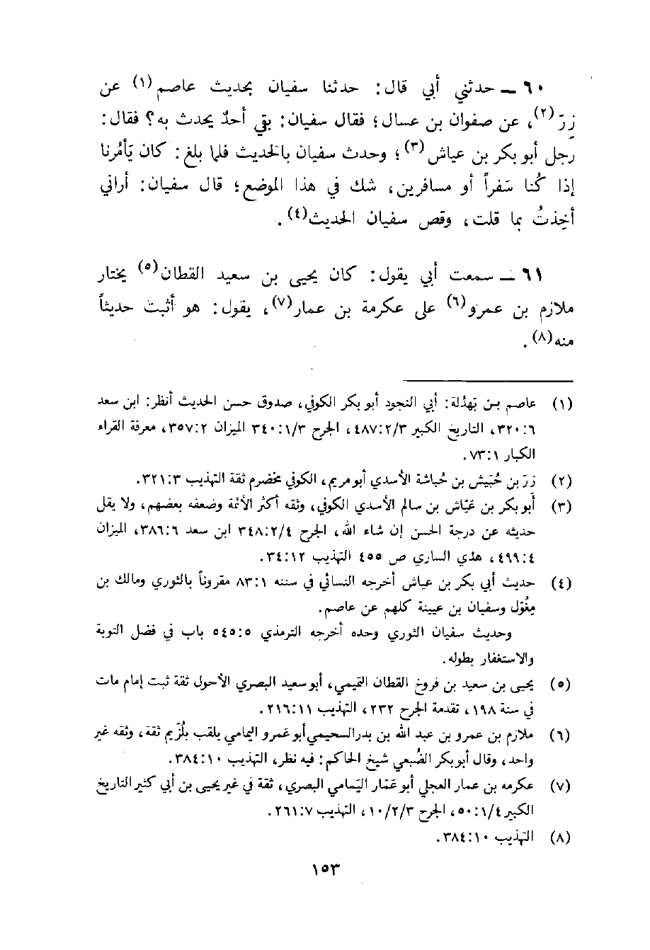 60 - حَدثنِي أبي قَالَ حَدثنَا سُفْيَان بِحَدِيث عَاصِم عَن زر عَن صَفْوَان بن عَسَّال فَقَالَ سُفْيَان بقى أحد يحدث بِهِ فَقَالَ رجل أَبُو بكر بن عَيَّاش وَحدث سُفْيَان بِالْحَدِيثِ فَلَمَّا بلغ كَانَ يَأْمُرنَا إِذا كُنَّا سفرا أَو مسافرين شكّ فِي هَذَا الْموضع قَالَ سُفْيَان أَرَانِي أخذت بِمَا قلت وقص سُفْيَان الحَدِيث