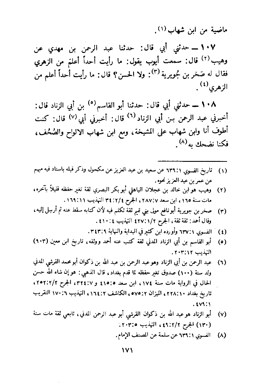 108 - حَدثنِي أبي قَالَ حَدثنَا أَبُو الْقَاسِم بن أبي الزِّنَاد قَالَ أَخْبرنِي عبد الرَّحْمَن بن أبي الزِّنَاد قَالَ أَخْبرنِي أبي قَالَ كنت أَطُوف أَنا وَابْن شهَاب على المشيخة وَمَعَ بن شهَاب الألواح والصحف فَكُنَّا نضحك بِهِ