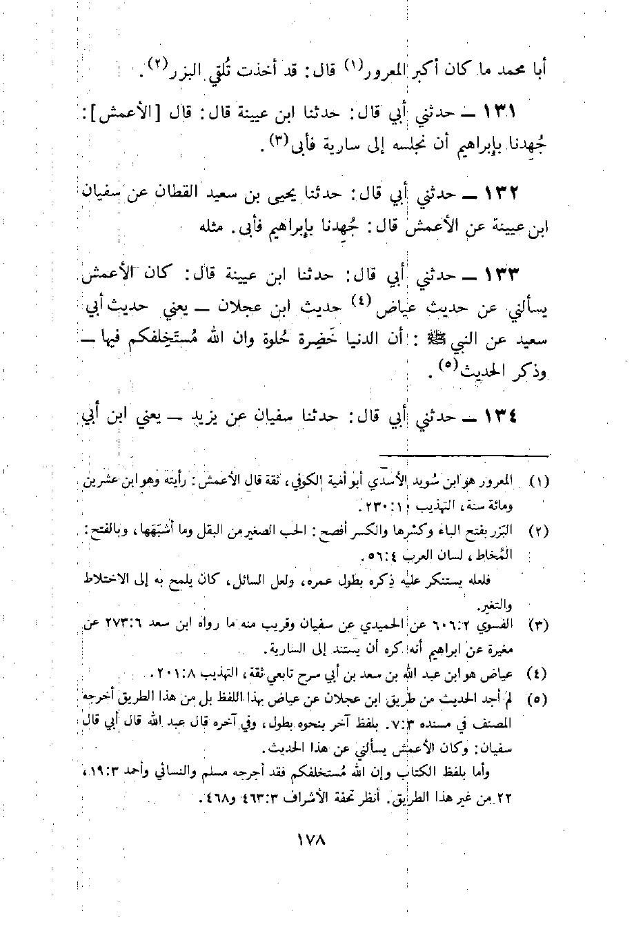 133 - حَدثنِي أبي قَالَ حَدثنَا بن عُيَيْنَةَ قَالَ كَانَ الْأَعْمَشُ يَسْأَلُنِي عَن حَدِيث عِيَاض حَدِيث بن عَجْلَانَ يَعْنِي حَدِيثَ أَبِي سَعِيدٍ عَنِ النَّبِيِّ صَلَّى اللَّهُ عَلَيْهِ وَسَلَّمَ أَنَّ الدُّنْيَا خَضِرَةٌ حُلْوَةٌ ووان الله مستخلفكم فِيهَا وَذَكَرَ الْحَدِيثَ