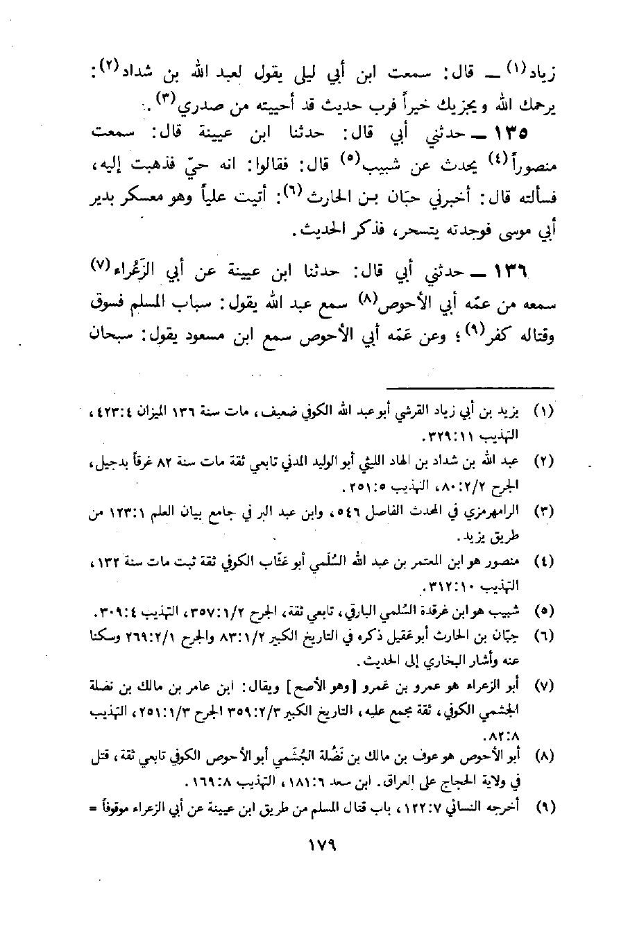136 - حَدثنِي أبي قَالَ حَدثنَا بن عُيَيْنَةَ عَنْ أَبِي الزَّعْرَاءِ سَمِعَهُ مِنْ عَمِّهِ أَبِي الأَحْوَصِ سَمِعَ عَبْدَ اللَّهِ يَقُولُ سِبَابُ الْمُسْلِمِ فُسُوقٌ وَقِتَالُهُ كُفْرٌ وَعَنْ عَمِّهِ أبي الْأَحْوَص سمع بن مَسْعُودٍ يَقُولُ سُبْحَانَ اللَّهِ عَدَدَ الْحَصَى وَسَمِعَ أَبَا الأَحْوَصِ عَمَّهُ قَالَ سَمِعت بن مَسْعُودٍ الشَّقِيُّ مَنْ شَقِيَ فِي بَطْنِ أُمِّهِ وَالسَّعِيدُ مَنْ وُعِظَ بِغَيْرِهِ