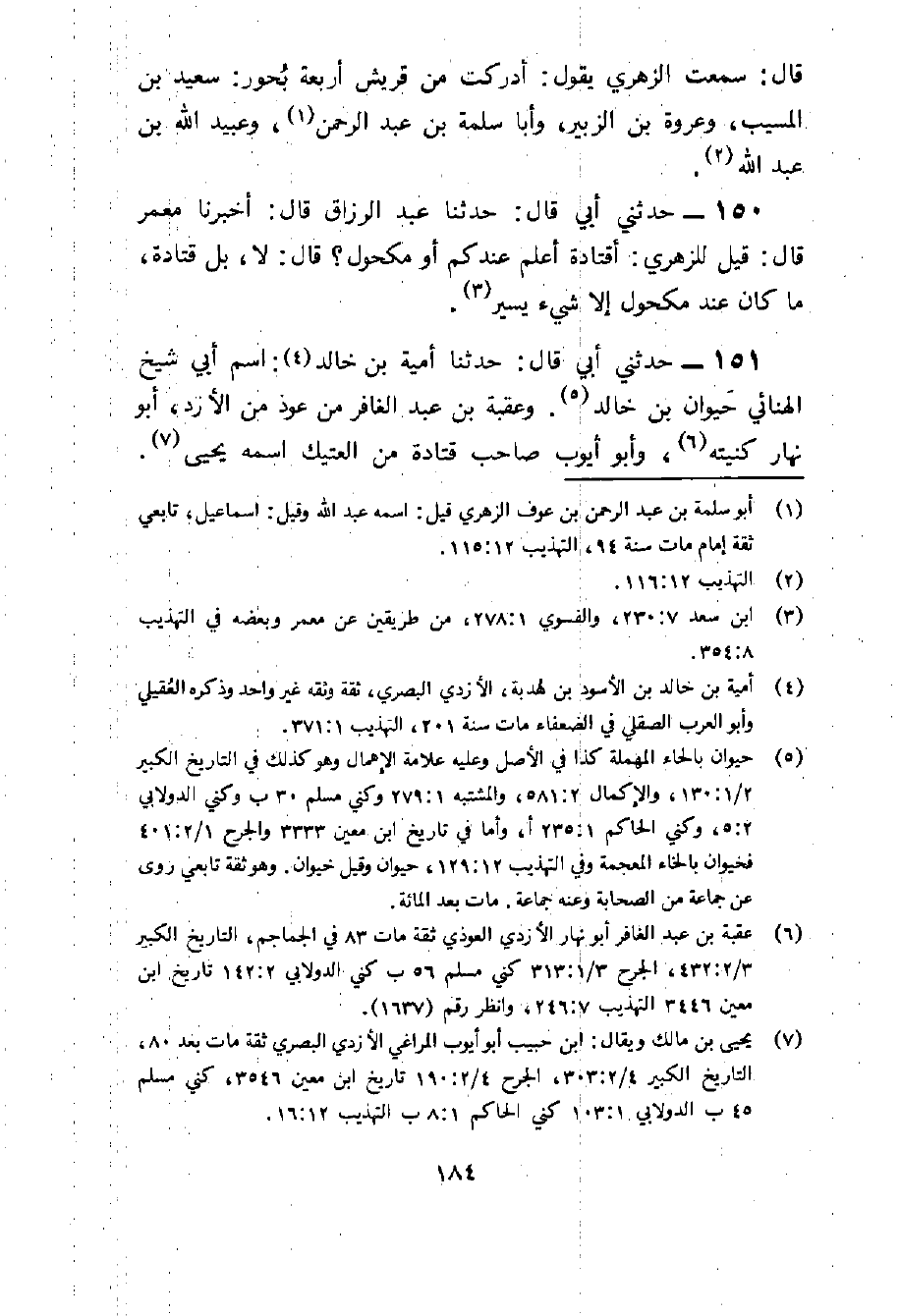 150 - حَدثنِي أبي قَالَ حَدثنَا عبد الرَّزَّاق قَالَ أخبرنَا معمر قَالَ قيل لِلزهْرِيِّ أقتادة أعلم عنْدكُمْ أَو مَكْحُول قَالَ لَا بل قَتَادَة مَا كَانَ عِنْد مَكْحُول إِلَّا شَيْء يسير