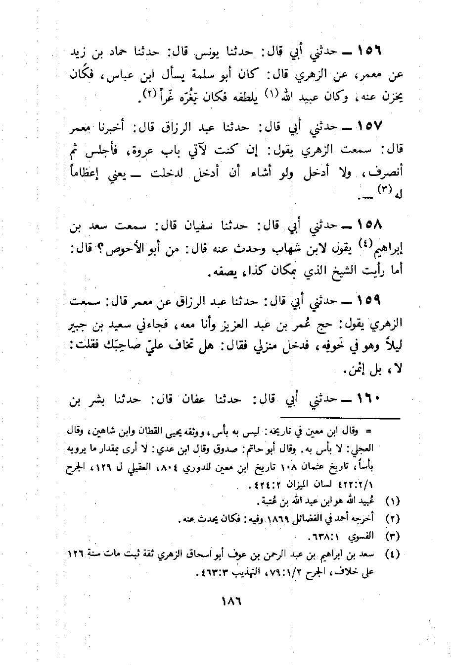 157 - حَدثنِي أبي قَالَ حَدثنَا عبد الرَّزَّاق قَالَ أخبرنَا معمر قَالَ سَمِعت الزُّهْرِيّ يَقُول إِن كنت لآتي بَاب عُرْوَة فأجلس ثمَّ انْصَرف وَلَا أَدخل وَلَو أَشَاء أَن أَدخل لدخلت يَعْنِي إعظاما لَهُ