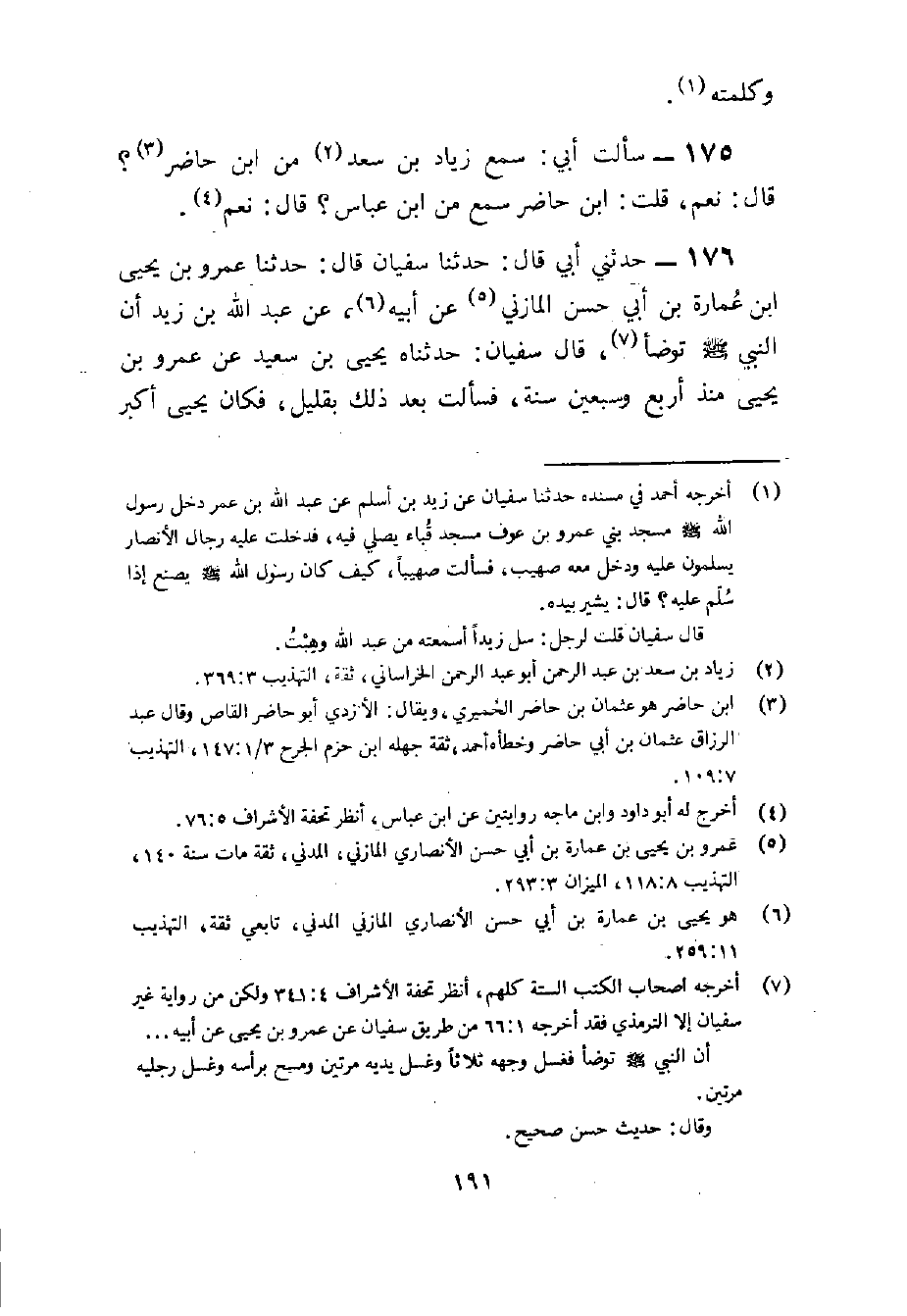 176 - حَدَّثَنِي أَبِي قَالَ حَدثنَا سُفْيَان قَالَ حَدثنَا عَمْرُو بْنُ يَحْيَى بْنِ عُمَارَةَ بْنِ أَبِي حَسَنٍ الْمَازِنِيُّ عَنْ أَبِيهِ عَنْ عَبْدِ اللَّهِ بْنِ زَيْدٍ أَنَّ النَّبِيَّ صَلَّى اللَّهُ عَلَيْهِ وَسَلَّمَ تَوَضَّأَ قَالَ سُفْيَانُ حَدَّثَنَاهُ يَحْيَى بْنُ سَعِيدٍ عَنْ عَمْرِو بْنِ يَحْيَى مُنْذُ أَرْبَعٍ وَسَبْعِينَ سَنَةً فَسَأَلْتُ بَعْدَ ذَلِكَ بِقَلِيلٍ فَكَانَ يَحْيَى أَكْبَرَ مِنْهُ قَالَ أبي قَالَ سُفْيَان سَمِعت مِنْهُ ثَلَاثَة أَحَادِيث قَالَ أبي وَسمعت أَنا هَذَا الحَدِيث من سُفْيَان ثَلَاث مرار قَالَ أبي قَالَ سُفْيَان لم أسمع مِنْهُ حَدِيث عَمْرو بن يحيى عَن أَبِيه عَن النَّبِي صلى الله عَلَيْهِ وَسلم فِي الْحمام والمقبرة قَالَ أبي قد حَدثنَا بِهِ سُفْيَان دلسه