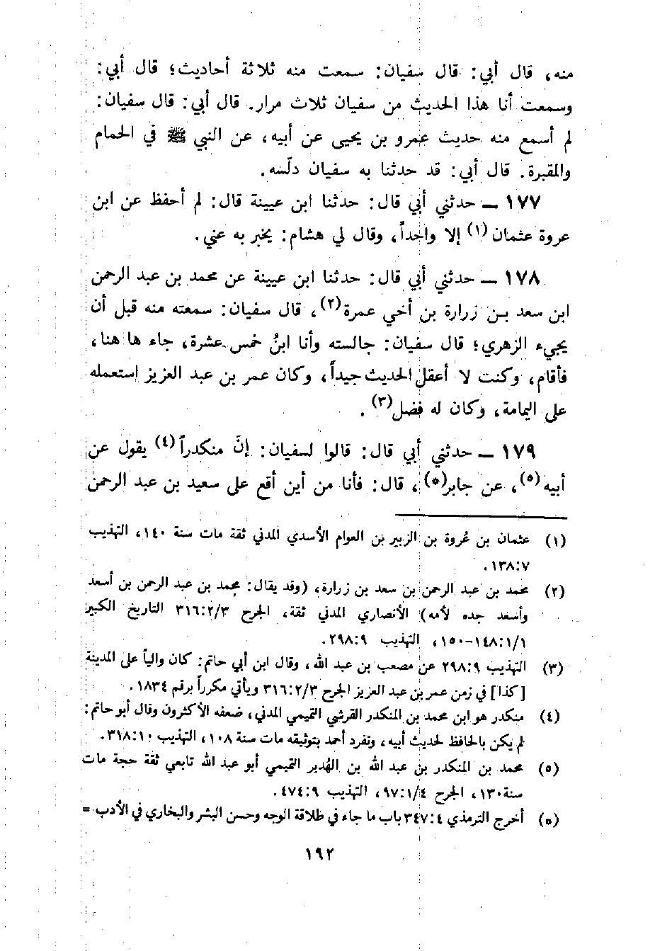 178 - حَدثنِي أبي قَالَ حَدثنَا بن عُيَيْنَة عَن مُحَمَّد بن عبد الرَّحْمَن بن سعد بن زُرَارَة بن أخي عمْرَة قَالَ سُفْيَان سمعته مِنْهُ قبل أَن يَجِيء الزُّهْرِيّ قَالَ سُفْيَان جالسته وَأَنا بن خمس عشرَة جَاءَ هَا هُنَا فَأَقَامَ وَكنت لَا أَعقل الحَدِيث جيدا وَكَانَ عمر بن عبد الْعَزِيز اسْتَعْملهُ على الْيَمَامَة وَكَانَ لَهُ فضل
