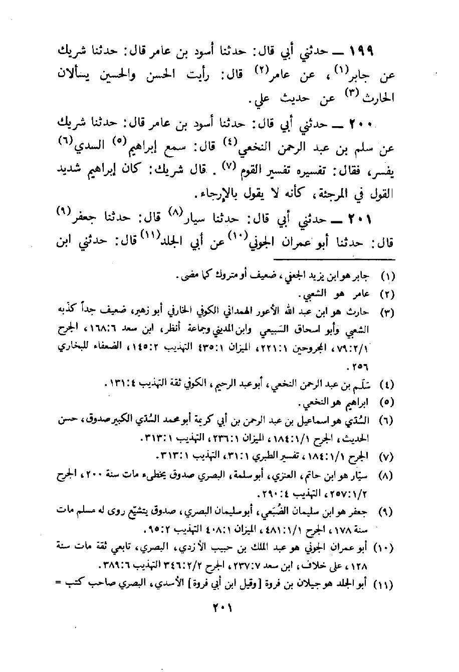 200 - حَدثنِي أبي قَالَ حَدثنَا أسود بن عَامر قَالَ حَدثنَا شريك عَن سلم بن عبد الرَّحْمَن النَّخعِيّ قَالَ سمع إِبْرَاهِيم السّديّ يُفَسر فَقَالَ تَفْسِيره تَفْسِير الْقَوْم قَالَ شريك كَانَ إِبْرَاهِيم شَدِيد القَوْل فِي المرجئة كَأَنَّهُ لَا يَقُول بالإرجاء
