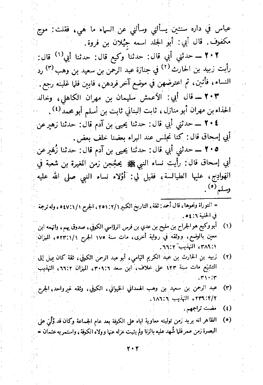 202 - حَدثنِي أبي قَالَ حَدثنَا وَكِيع قَالَ حَدثنَا أبي قَالَ رَأَيْت زبيد بن الْحَارِث فِي جَنَازَة عبد الرَّحْمَن بن سعيد بن وهب رد النِّسَاء فَأَتَيْنَ ثمَّ اعترضهن فِي مَوضِع آخر فردهن فأبين فَلَمَّا غلبنه رَجَعَ