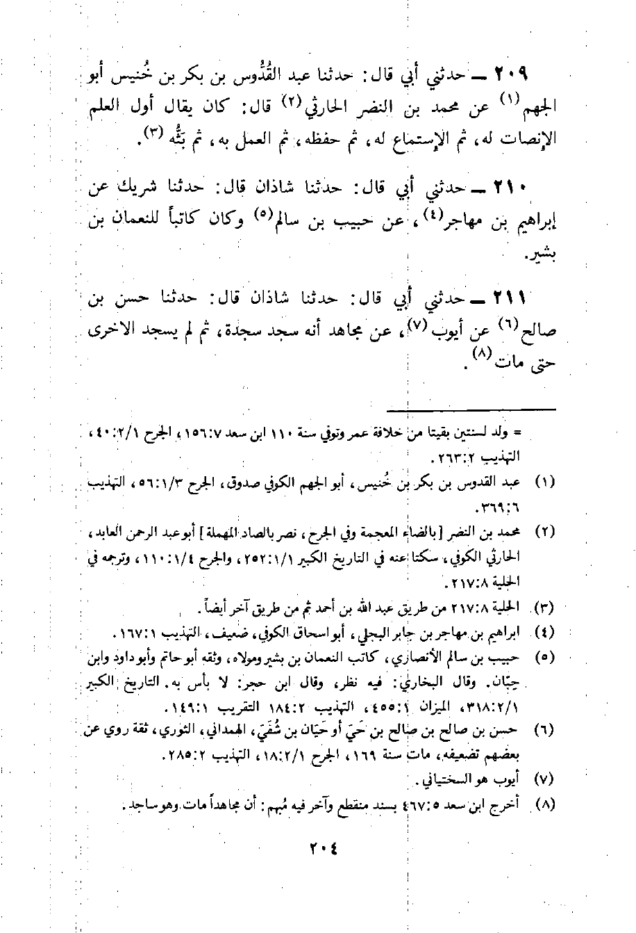 209 - حَدثنِي أبي قَالَ حَدثنَا عبد القدوس بن بكر بن خُنَيْس أَبُو الجهم عَن مُحَمَّد بن النَّضر الْحَارِثِيّ قَالَ كَانَ يُقَال أول الْعلم الْإِنْصَات لَهُ ثمَّ الِاسْتِمَاع لَهُ ثمَّ حفظه ثمَّ الْعَمَل بِهِ ثمَّ بثه