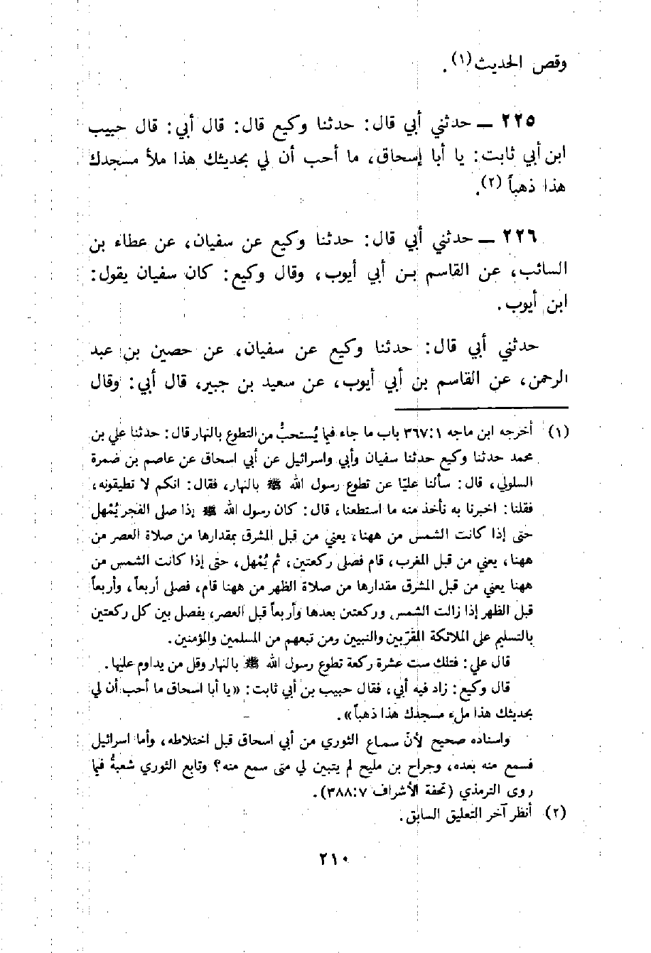 225 - حَدثنِي أبي قَالَ حَدثنَا وَكِيع قَالَ قَالَ أبي قَالَ حبيب بن أبي ثَابت يَا أَبَا إِسْحَاق مَا أحب أَن لي بحديثك هَذَا مَلأ مسجدك هَذَا ذَهَبا