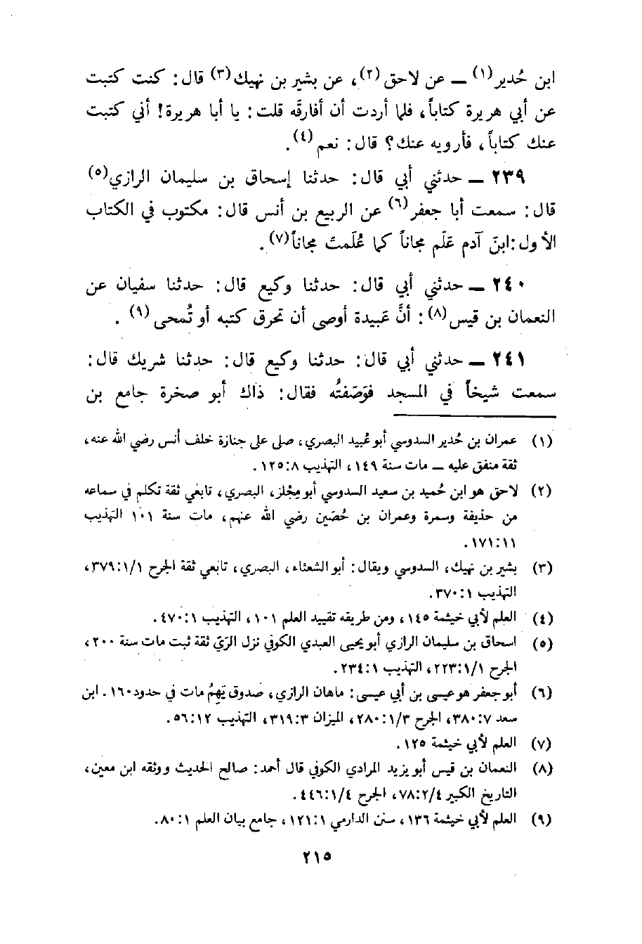 239 - حَدثنِي أبي قَالَ حَدثنَا إِسْحَاق بن سُلَيْمَان الرَّازِيّ قَالَ سَمِعت أَبَا جَعْفَر عَن الرّبيع بن أنس فَقَالَ مَكْتُوب فِي الْكتاب الأول بن آدم علم مجَّانا كَمَا علمت مجَّانا