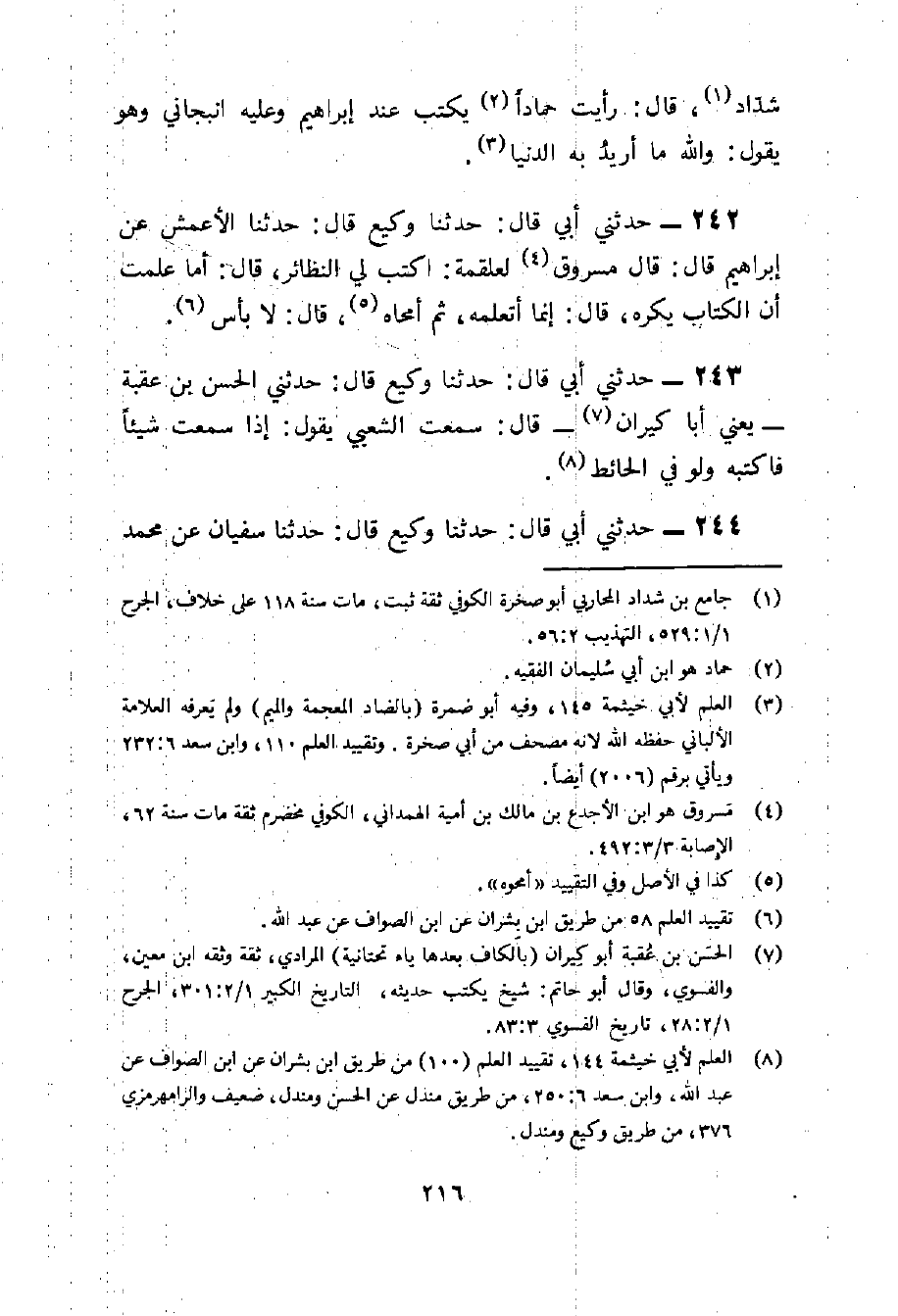242 - حَدثنِي أبي قَالَ حَدثنَا وَكِيع قَالَ حَدثنَا الْأَعْمَش عَن إِبْرَاهِيم قَالَ قَالَ مَسْرُوق لعلقمة اكْتُبْ لي النَّظَائِر قَالَ أما علمت أَن الْكتاب يكره قَالَ إِنَّمَا أتعلمه ثمَّ أمحاه قَالَ لَا بَأْس