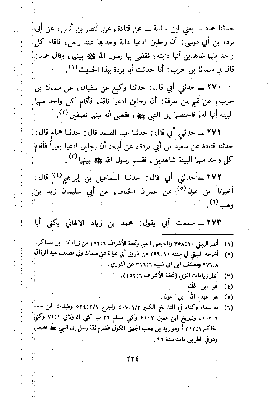 270 - حَدثنِي أبي قَالَ حَدثنَا وَكِيعٌ عَنْ سُفْيَانَ عَنْ سِمَاكِ بْنِ حَرْبٍ عَنْ تَمِيمِ بْنِ طَرَفَةَ أَنَّ رَجُلَيْنِ ادَّعَيَا نَاقَةً فَأَقَامَ كُلُّ وَاحِدٍ مِنْهُمَا الْبَيِّنَةَ أَنَّهَا لَهُ فَاخْتَصَمَا إِلَى النَّبِيِّ صَلَّى اللَّهُ عَلَيْهِ وَسَلَّمَ فَقَضَى أَنَّهُ بَيْنَهُمَا نِصْفَيْنِ