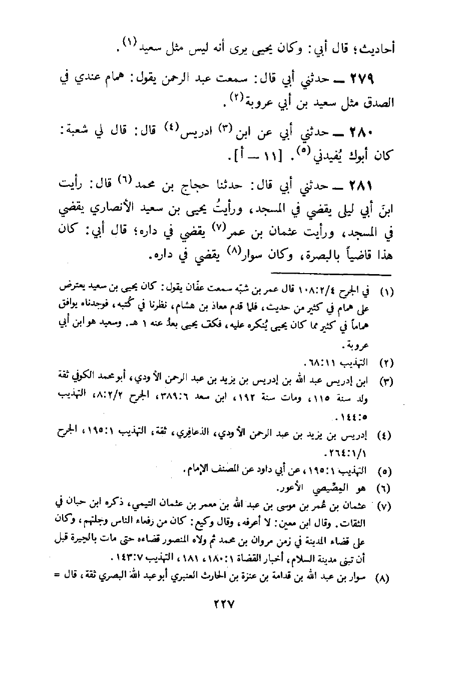 281 - حَدثنِي أبي قَالَ حَدثنَا حجاج بن مُحَمَّد قَالَ رَأَيْت بن أبي ليلى يقْضِي فِي الْمَسْجِد وَرَأَيْت يحيى بن سعيد الْأنْصَارِيّ يقْضِي فِي الْمَسْجِد وَرَأَيْت عُثْمَان بن عمر يقْضِي فِي دَاره قَالَ أبي كَانَ هَذَا قَاضِيا بِالْبَصْرَةِ وَكَانَ سوار يقْضِي فِي دَاره