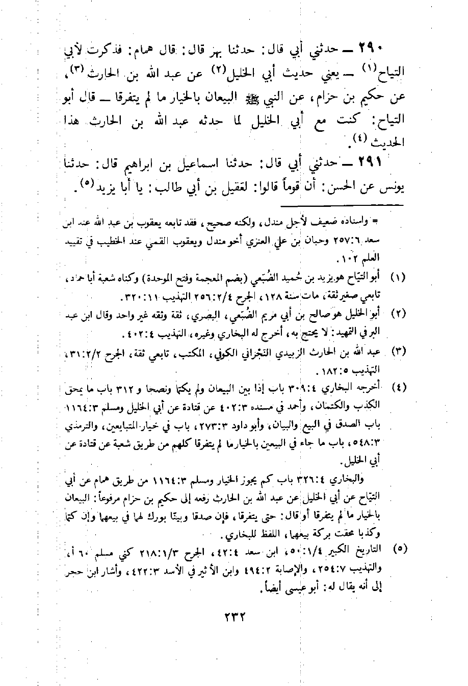 290 - حَدثنِي أبي قَالَ حَدثنَا بَهْزٌ قَالَ قَالَ هَمَّامٌ فَذَكَرْتُ لأَبِي التَّيَّاحِ يَعْنِي حَدِيثَ أَبِي الْخَلِيلِ عَنْ عَبْدِ اللَّهِ بْنِ الْحَارِثِ عَنْ حَكِيمِ بْنِ حِزَامٍ عَنِ النَّبِيِّ صَلَّى اللَّهُ عَلَيْهِ وَسَلَّمَ الْبَيِّعَانِ بِالْخِيَارِ مَا لَمْ يَتَفَرَّقَا قَالَ أَبُو التَّيَّاحِ كُنْتُ مَعَ أَبِي الْخَلِيلِ لَمَّا حَدَّثَهُ عَبْدُ اللَّهِ بْنُ الْحَارِثِ هَذَا الحَدِيث