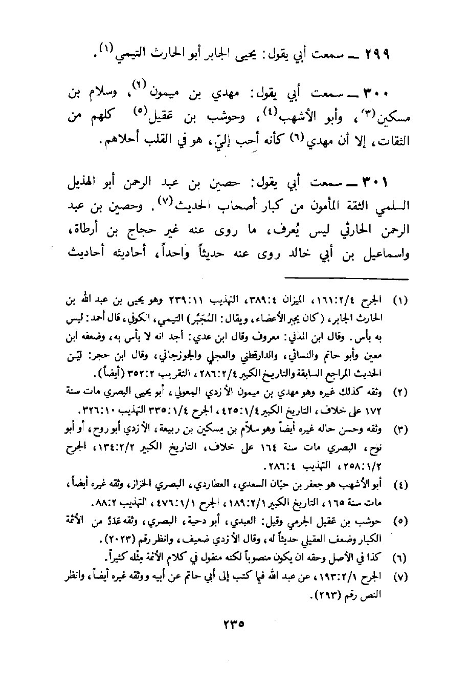 300 - سَمِعت أبي يَقُول مهْدي بن مَيْمُون وَسَلام بن مِسْكين وَأَبُو الْأَشْهب وحوشب بن عقيل كلهم من الثِّقَات إِلَّا أَن مهْدي كَأَنَّهُ أحب إِلَيّ هُوَ فِي الْقلب أحلاهم