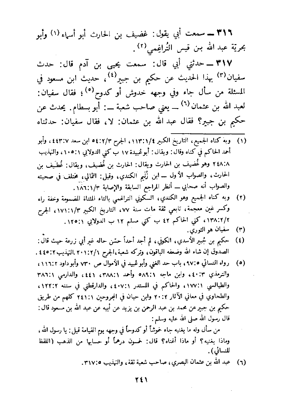 317 - حَدثنِي أبي قَالَ سَمِعت يحيى بن آدم قَالَ حدث سُفْيَان بِهَذَا الحَدِيث عَن حَكِيم بن جُبَير حَدِيث بن مَسْعُود فِي المسئلة من سَأَلَ جَاءَ وَفِي وَجهه خدوش أَو كدوح فَقَالَ سُفْيَان لعبد الله بن عُثْمَان يَعْنِي صَاحب شُعْبَة أَبُو بسطَام يحدث عَن حَكِيم بن جُبَير فَقَالَ عبد الله بن عُثْمَان لَا فَقَالَ سُفْيَان حدّثنَاهُ زبيد الأيامي عَن مُحَمَّد بن عبد الرَّحْمَن قَالَ أبي وَكَانَ شُعْبَة لَا يحدث عَن حَكِيم بن جُبَير وَكَانَ عبد الرَّحْمَن لَا يحدثنا عَنهُ ترك حَدِيثه وَهُوَ أَبُو جَعْفَر المدايني هُوَ بن مسور