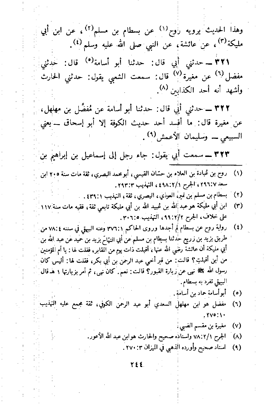 321 - حَدثنِي أبي قَالَ حَدثنَا أَبُو أُسَامَة قَالَ حَدثنِي مفضل عَن مُغيرَة قَالَ سَمِعت الشّعبِيّ يَقُول حَدثنِي الْحَارِث وَأشْهد أَنه أحد الْكَذَّابين