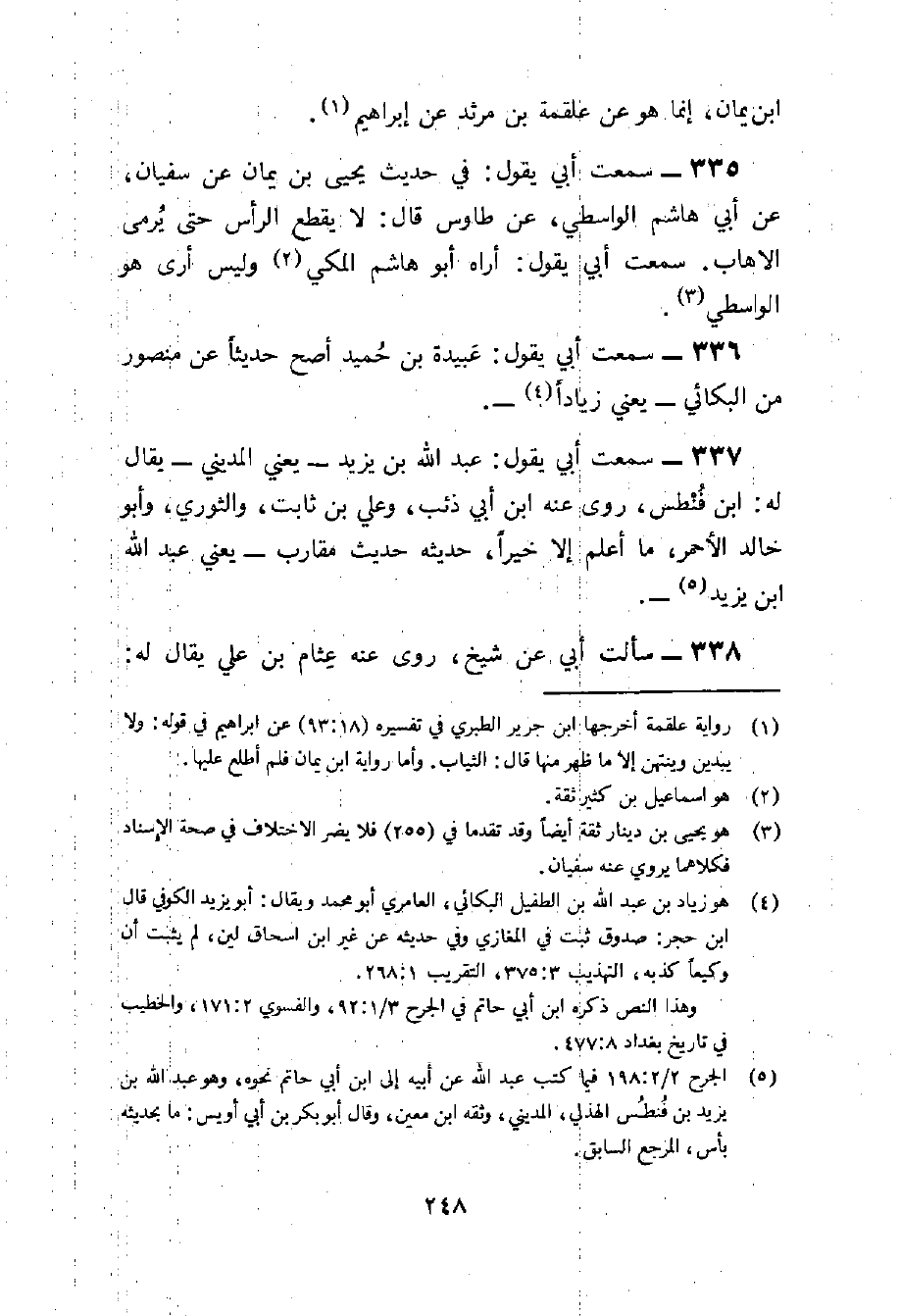 335 - سَمِعت أبي يَقُول فِي حَدِيث يحيى بن يمَان عَن سُفْيَان عَن أبي هَاشم الوَاسِطِيّ عَن طَاوس قَالَ لَا يقطع الرَّأْس حَتَّى يَرْمِي الأهاب سَمِعت أبي يَقُول أرَاهُ أَبُو هَاشم الْمَكِّيّ وَلَيْسَ أرى هُوَ الوَاسِطِيّ