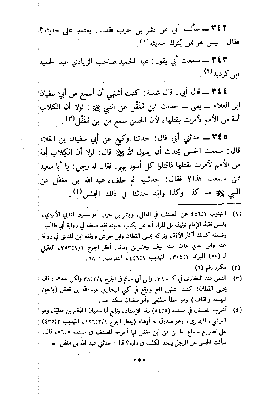 344 - قَالَ أَبِي قَالَ شُعْبَةُ كُنْتُ أَشْتَهِي أَنْ أَسْمَعَ مِنْ أَبِي سُفْيَانَ بْنِ الْعَلَاءِ يَعْنِي حَدِيث بْنُ مُغَفَّلٍ عَنِ النَّبِيِ صَلَّى اللَّهُ عَلَيْهِ وَسَلَّمَ لَوْلَا أَنَّ الْكِلَابَ أُمَّةٌ مِنَ الْأُمَمِ لَأَمَرْتُ بِقَتْلِهَا لِأَنَّ الْحَسَنَ سَمِعَ مِنَ بن مُغَفَّلٍ