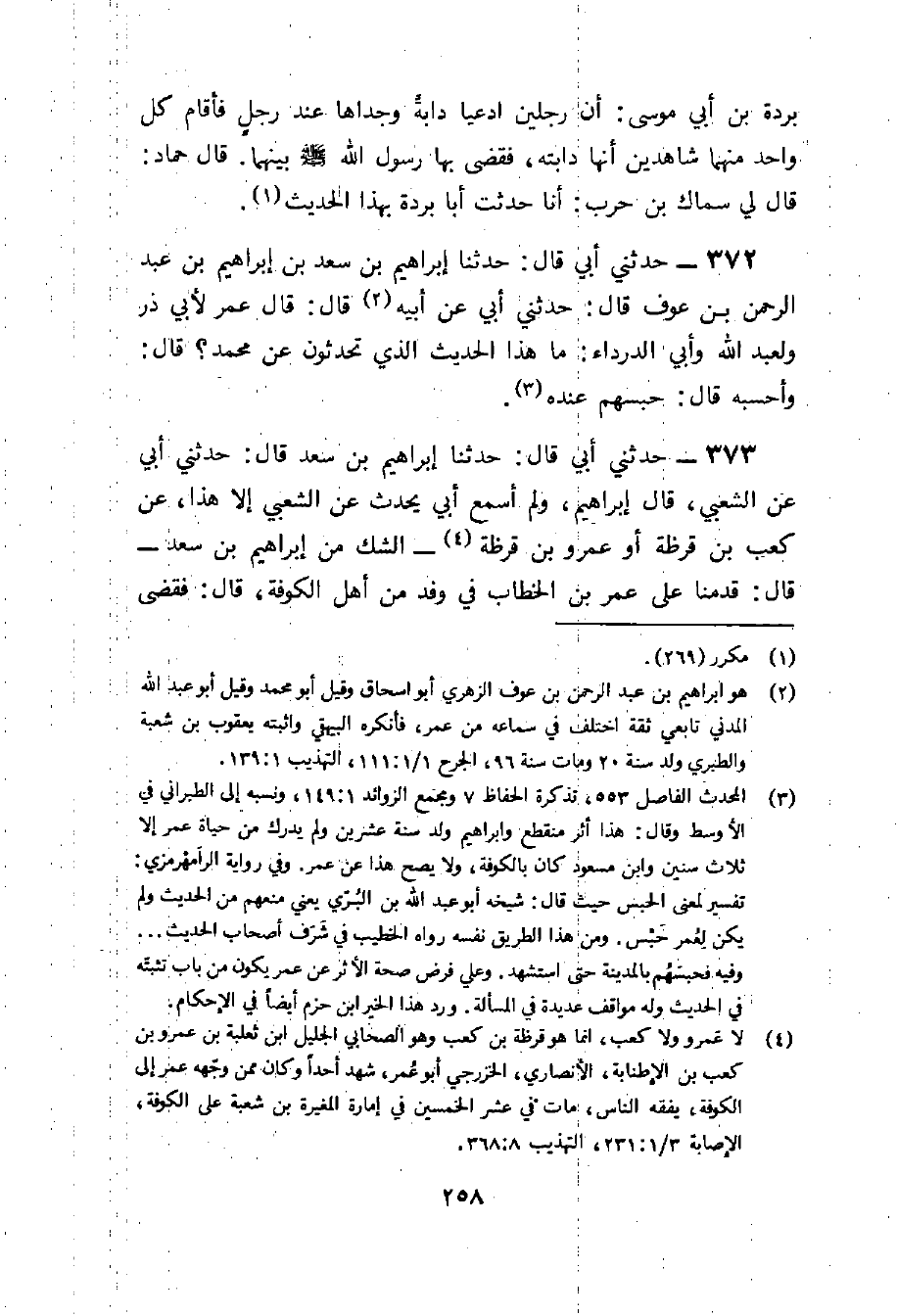 373 - حَدثنِي أبي قَالَ حَدثنَا إِبْرَاهِيم بن سعد قَالَ حَدثنِي أبي عَن الشّعبِيّ قَالَ إِبْرَاهِيم وَلم أسمع أبي يحدث عَن الشّعبِيّ إِلَّا هَذَا عَن كَعْب بن قرظة أَو عَمْرو بن قرظة الشَّك من إِبْرَاهِيم بن سعد قَالَ قدمنَا على عمر بن الْخطاب فِي وَفد من أهل الْكُوفَة قَالَ فَقضى من حوايجنا مَا قضى حَتَّى إِذا ودعناه وَخَرجْنَا لحقنا عمر وَهُوَ يُنَادي يعلق نَعله فِي يَدَيْهِ قَالَ فَلَمَّا رَأَيْنَاهُ وقفنا لَهُ حَتَّى إِذا جَاءَ قَالَ فَقَالَ إِنِّي ذكرت أَنكُمْ تقدمون غَدا على قوم قَالَ أبي فَتكلم إِبْرَاهِيم بِكَلَام لم أفهمهُ فأقلوا الرِّوَايَة عَلَى رَسُولِ اللَّهِ صَلَّى اللَّهُ عَلَيْهِ وَسلم وَأَنا شريككم