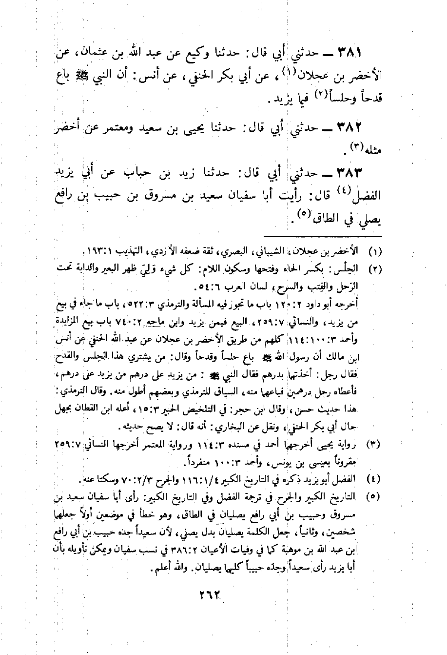 383 - حَدثنِي أبي قَالَ حَدثنَا زيد بن حباب عَن أبي يزِيد الْفضل قَالَ رَأَيْت أَبَا سُفْيَان سعيد بن مَسْرُوق بن حبيب بن رَافع يُصَلِّي فِي الطاق