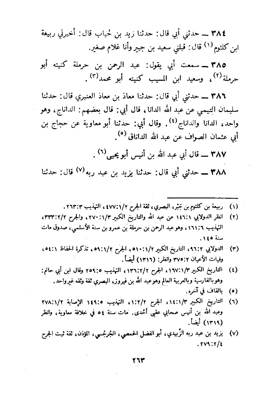 385 - سَمِعت أبي يَقُول عبد الرَّحْمَن بن حَرْمَلَة كنيته أَبُو حَرْمَلَة وَسَعِيد بن الْمسيب كنيته أَبُو مُحَمَّد