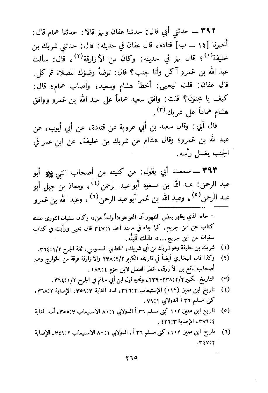 392 - حَدَّثَنِي أَبِي قَالَ حَدَّثَنَا عَفَّانُ وَبَهْزٌ قَالا حَدَّثَنَا هَمَّامٌ قَالَ أَخْبَرَنَا قَتَادَةُ قَالَ عَفَّانُ فِي حَدِيثِهِ قَالَ حَدَّثَنِي شَرِيكُ بْنُ خَلِيفَةَ قَالَ بَهْزٌ فِي حَدِيثِهِ وَكَانَ مِنَ الأَزَارِقَةِ قَالَ سَأَلْتُ عَبْدَ اللَّهِ بْنَ عَمْرٍو آكُلُ وَأَنَا جُنُبٌ قَالَ تَوَضَّأْ وضوؤك لِلصَّلاةِ ثُمَّ كُلْ قَالَ عَفَّانُ قُلْتُ لِيَحْيَى أَخْطَأَ هِشَامٌ وَسَعِيدٌ وَأَصَابَ هَمَّامٌ قَالَ كَيْفَ يَا مَجْنُونُ قُلْتُ وَافَقَ سَعِيدٌ هَمَّامًا عَلَى عَبْدِ اللَّهِ بْنِ عَمْرٍو وَوَافَقَ هِشَامٌ هَمَّامًا عَلَى شَرِيكٍ قَالَ أَبِي وَقَالَ سَعِيدُ بْنُ أَبِي عَرُوبَةَ عَنْ قَتَادَةَ عَنْ أَبِي أَيُّوبَ عَنْ عَبْدِ اللَّهِ بْنِ عَمْرٍو وَقَالَ هِشَامٌ عَنْ شريك بن خَليفَة عَن بن عُمَرَ فِي الْجُنُبِ يَغْسِلُ رَأْسَهُ