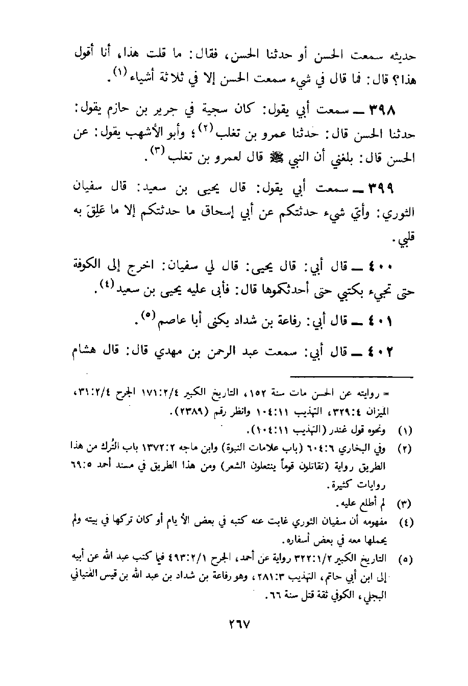 402 - قَالَ أبي سَمِعت عبد الرَّحْمَن بن مهْدي قَالَ قَالَ هِشَام الدستوَائي لَو شهِدت على ضرب عنق قَتَادَة جَازَ يَعْنِي فِي الحَدِيث كَأَنَّهُ قد استثبت