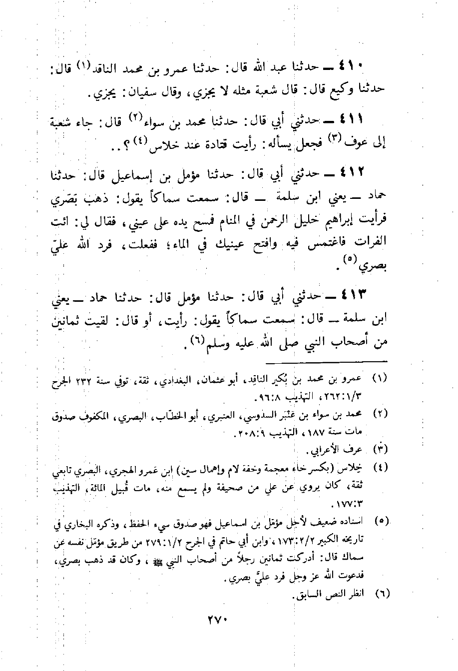 412 - حَدثنِي أَبِي قَالَ حَدَّثَنَا مُؤَمَّلُ بْنُ إِسْمَاعِيل قَالَ حَدثنَا حَمَّاد يَعْنِي بن سَلمَة قَالَ سَمِعت سماكا يَقُول ذهب بَصرِي فَرَأَيْت إِبْرَاهِيم خَلِيل الرَّحْمَن فِي الْمَنَام فَمسح يَده على عَيْني فَقَالَ لي ائْتِ الْفُرَات فاغتمس فِيهِ وَافْتَحْ عَيْنَيْك فِي المَاء فَفعلت فَرد الله عَليّ بَصرِي