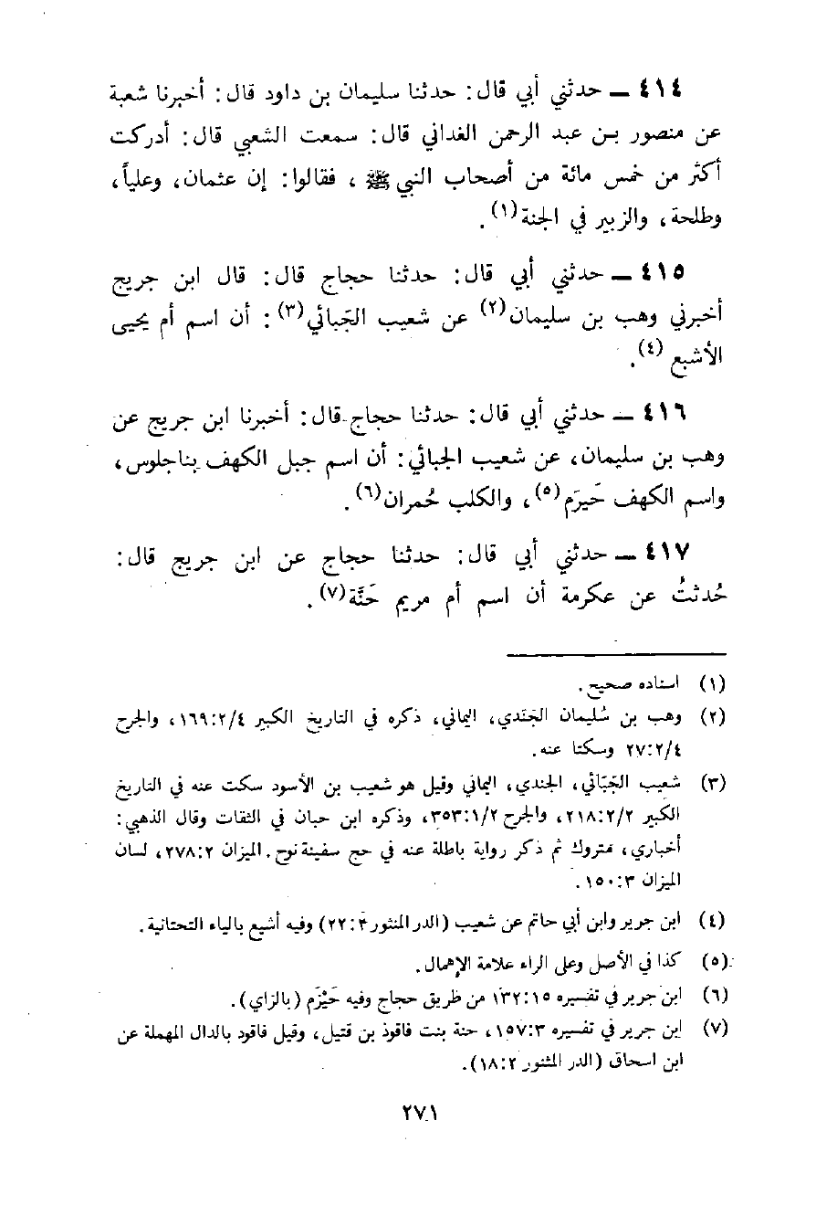 416 - حَدثنِي أبي قَالَ حَدثنَا حجاج قَالَ أخبرنَا بن جريج عَن وهب بن سُلَيْمَان عَن شُعَيْب الجبائي أَن اسْم جبل الْكَهْف بناجلوس وَاسم الْكَهْف حيرم وَالْكَلب حمْرَان