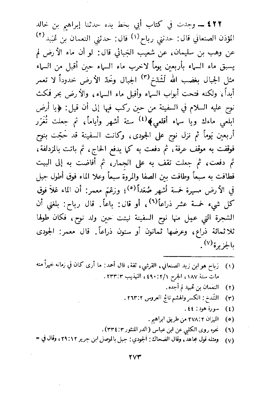 422 - وَجَدْتُ فِي كِتَابِ أَبِي بِخَط يَده حَدثنَا إِبْرَاهِيم بن خَالِد الْمُؤَذّن الصَّنْعَانِيّ قَالَ حَدثنِي رَبَاح قَالَ حَدثنِي النُّعْمَان بن عبيد عَن وهب بن سُلَيْمَان عَن شُعَيْب الجبائي قَالَ لَو أَن مَاء الأَرْض لم يسْبق مَاء السَّمَاء بِأَرْبَعِينَ يَوْمًا لأخرب مَاء السَّمَاء حِين أقبل من السَّمَاء مثل الْجبَال بغضب الله لشدخ الْجبَال وخد الأَرْض خدودا لَا تعمر أبدا وَلكنه فتحت أَبْوَاب السَّمَاء وَأَقْبل مَاء السَّمَاء وَالْأَرْض بَحر فَمَكثَ نوح عَلَيْهِ السَّلَام فِي السَّفِينَة من حِين ركب فِيهَا إِلَى أَن قيل يَا أَرْضُ ابْلَعِي مَاءَكِ وَيَا سَمَاء أقلعي سِتَّة أشهر وأياما ثمَّ جعلت تغرر أَرْبَعِينَ يَوْمًا ثمَّ نزل نوح على الجودي وَكَانَت السَّفِينَة قد حجت بِنوح فوقفت بِهِ موقف عَرَفَة ثمَّ دفعت بِهِ كَمَا يدْفع الْحَاج ثمَّ باتت بِالْمُزْدَلِفَةِ ثمَّ دفعت ثمَّ جعلت تقف بِهِ على الْجمار ثمَّ أفاضت بِهِ إِلَى الْبَيْت فطافت بِهِ سبعا وطافت بَين الصَّفَا والمروة سبعا وَعلا المَاء فَوق أطول جبل فِي الأَرْض مسيرَة خَمْسَة أشهر صعدا وَزعم معمر أَن المَاء علا فَوق كل شَيْء خَمْسَة عشر ذراعان أَو قَالَ باعا قَالَ رَبَاح بَلغنِي أَن الشَّجَرَة الَّتِي عمل مِنْهَا نوح السَّفِينَة نَبتَت حِين ولد نوح فَكَانَ طولهَا ثَلَاثمِائَة ذِرَاع وعرضها ثَمَانُون أَو سِتُّونَ ذِرَاعا قَالَ معمر الجودي بالجزيرة