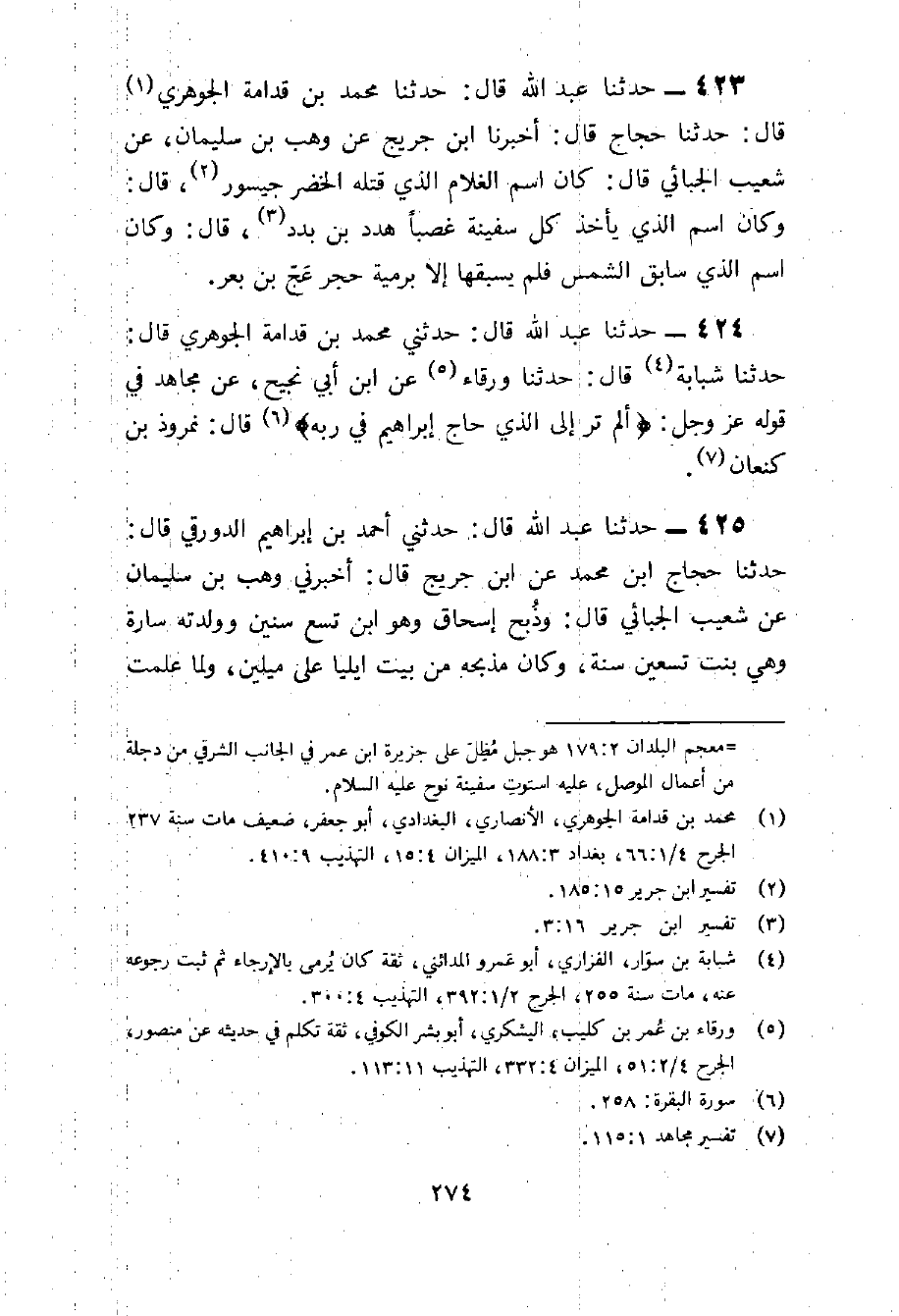 424 - حَدثنَا عبد الله قَالَ حَدثنِي مُحَمَّد بن قدامَة الْجَوْهَرِي قَالَ حَدثنَا شَبابَة قَالَ حَدثنَا وَرْقَاء عَن بن نجيح عَن مُجَاهِد فِي قَوْله عز وَجل أَلَمْ تَرَ إِلَى الَّذِي حَاجَّ إِبْرَاهِيمَ فِي رَبِّهِ قَالَ نمروذ بن كنعان