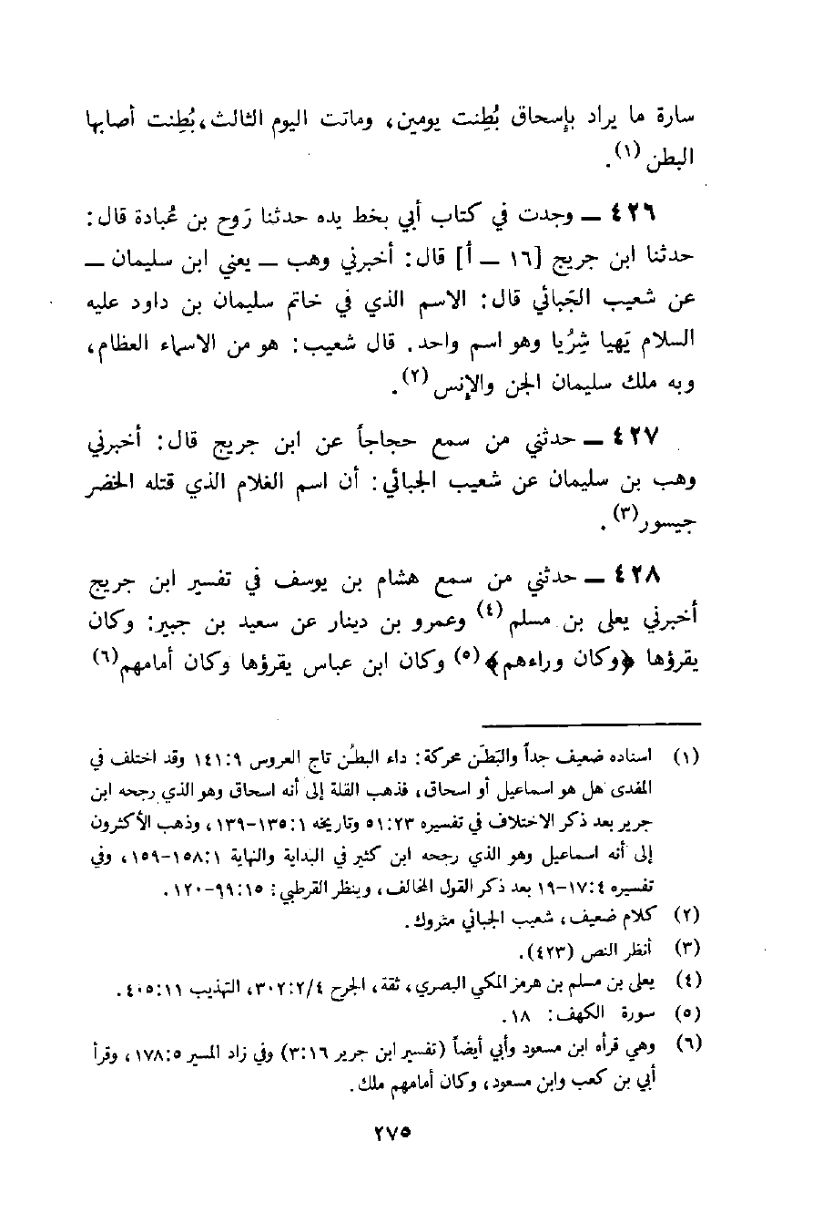 426 - وَجَدْتُ فِي كِتَابِ أَبِي بِخَط يَده حَدثنَا روح بن عبَادَة قَالَ حَدثنَا بن جريج قَالَ أَخْبرنِي وهب يَعْنِي بن سُلَيْمَان عَن شُعَيْب الجبائي قَالَ الِاسْم الَّذِي فِي خَاتم سُلَيْمَان بن دَاوُد عَلَيْهِ السَّلَام يهيا شريا وَهُوَ اسْم وَاحِد قَالَ شُعَيْب هُوَ من الْأَسْمَاء الْعِظَام وَبِه ملك سُلَيْمَان الْجِنّ وَالْإِنْس